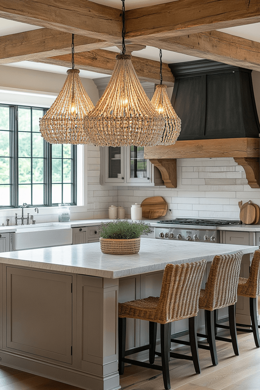 Beaded chandeliers bring handcrafted texture and soft warmth into the space. Light filters gently through layered elements. Kitchen lighting ideas like this feel inviting and unique. Positioned above gathering areas, they enhance ambiance. The design feels cozy and refined. Add handcrafted detail to your lighting.