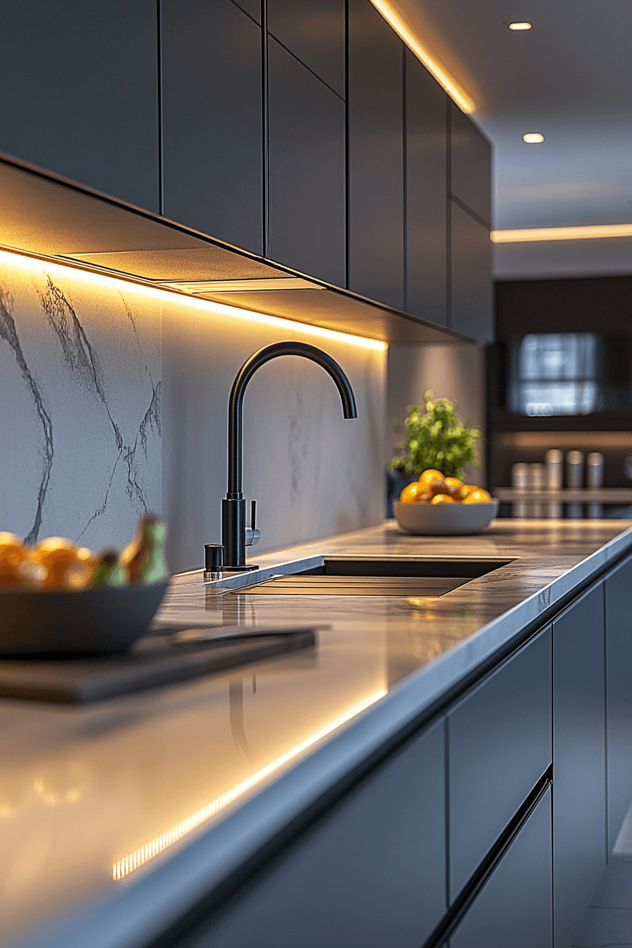 Slim LED strips introduce a modern glow that enhances both function and mood. Light runs along edges to create a soft, ambient effect. Kitchen lighting ideas like this allow flexibility in color and intensity. Tight spaces benefit from their compact design. The atmosphere feels sleek and inviting. Add a contemporary glow to your kitchen.