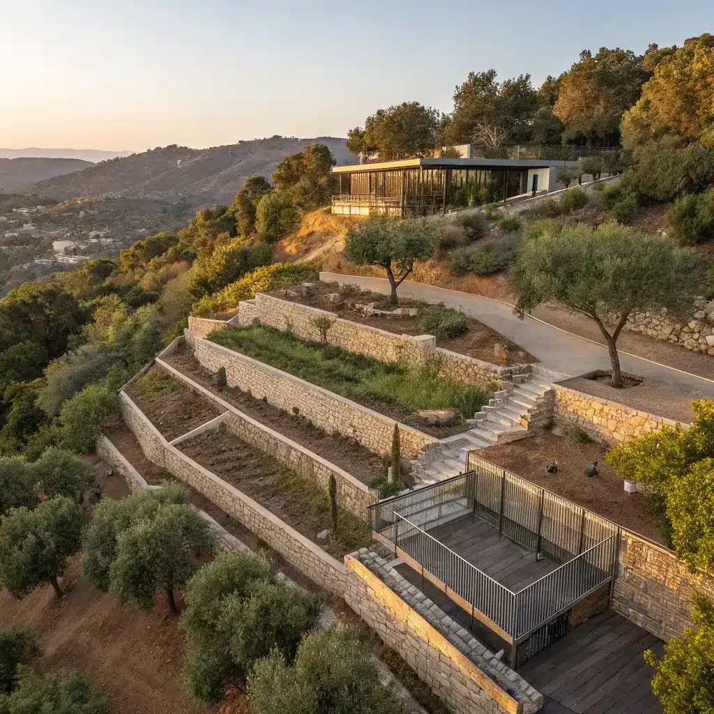 Retaining walls in concrete or natural stone add structure and definition to different zones.