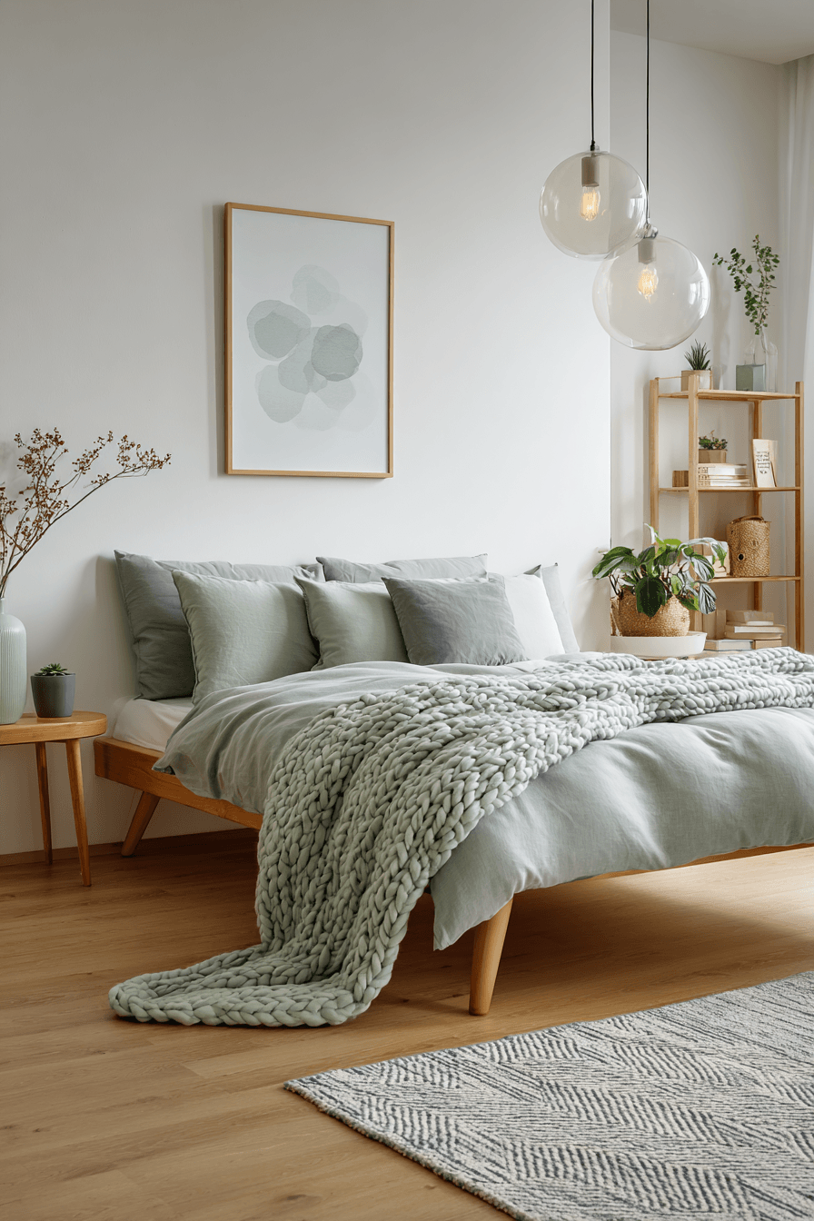 Scandinavian style pairs perfectly with a light sage green bedroom for a clean and inviting look. Crisp whites, light oak, and simple shapes keep the space uncluttered. Light sage green bedroom tones add warmth to the minimal design. Cozy textures like wool or soft rugs enhance comfort. The space feels functional and relaxing. Bring Scandinavian comfort into your room.