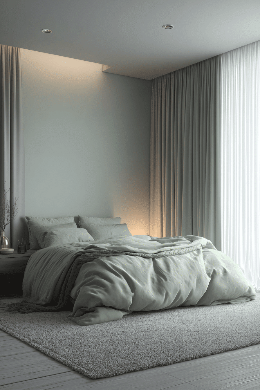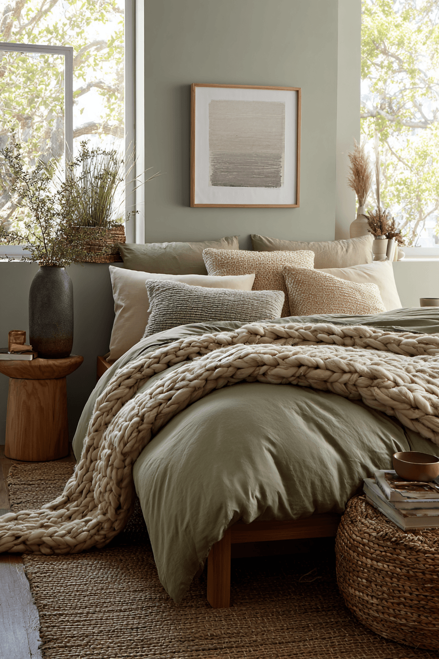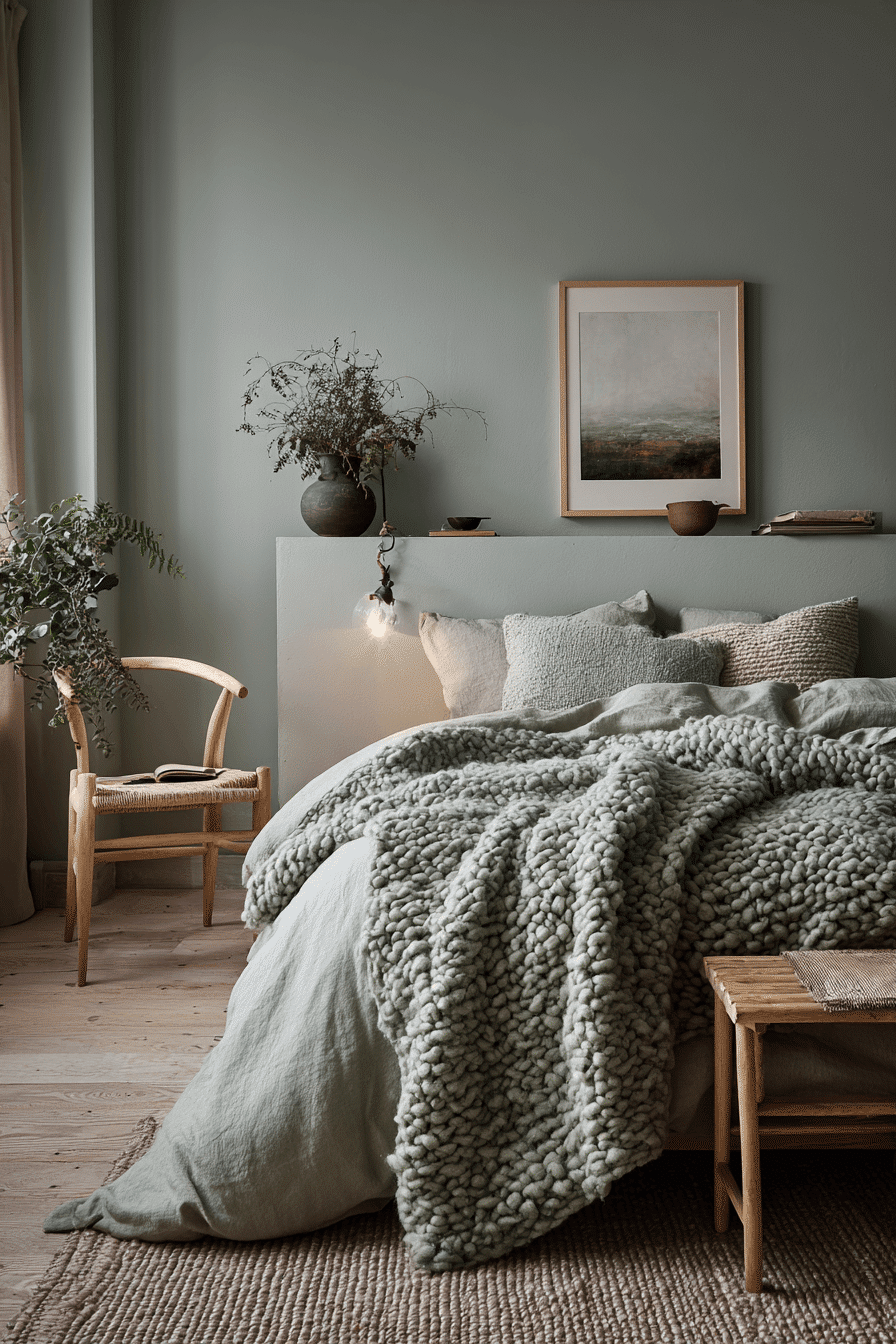 Plush layers make a light sage green bedroom feel extra cozy and inviting while maintaining a fresh look. Soft blankets, pillows, and warm lighting create a comforting atmosphere. Light sage green bedroom tones keep everything from feeling too heavy. Neutral accents balance the design beautifully. The room feels calm and restful. Cozy up your bedroom with layered comfort.