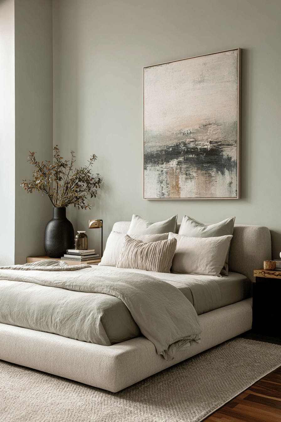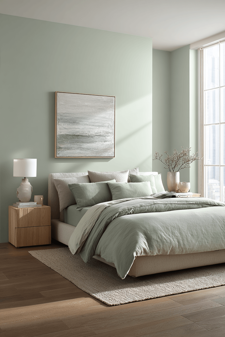 Soft neutral palettes create a peaceful atmosphere in a light sage green bedroom that feels calm and refined. Shades like beige, ivory, and natural materials blend seamlessly with sage tones. Light sage green bedroom styling stays modern while still feeling warm and livable. Simple decor and sculptural accents keep the look current. The room feels balanced without being boring. Create your own peaceful bedroom retreat.