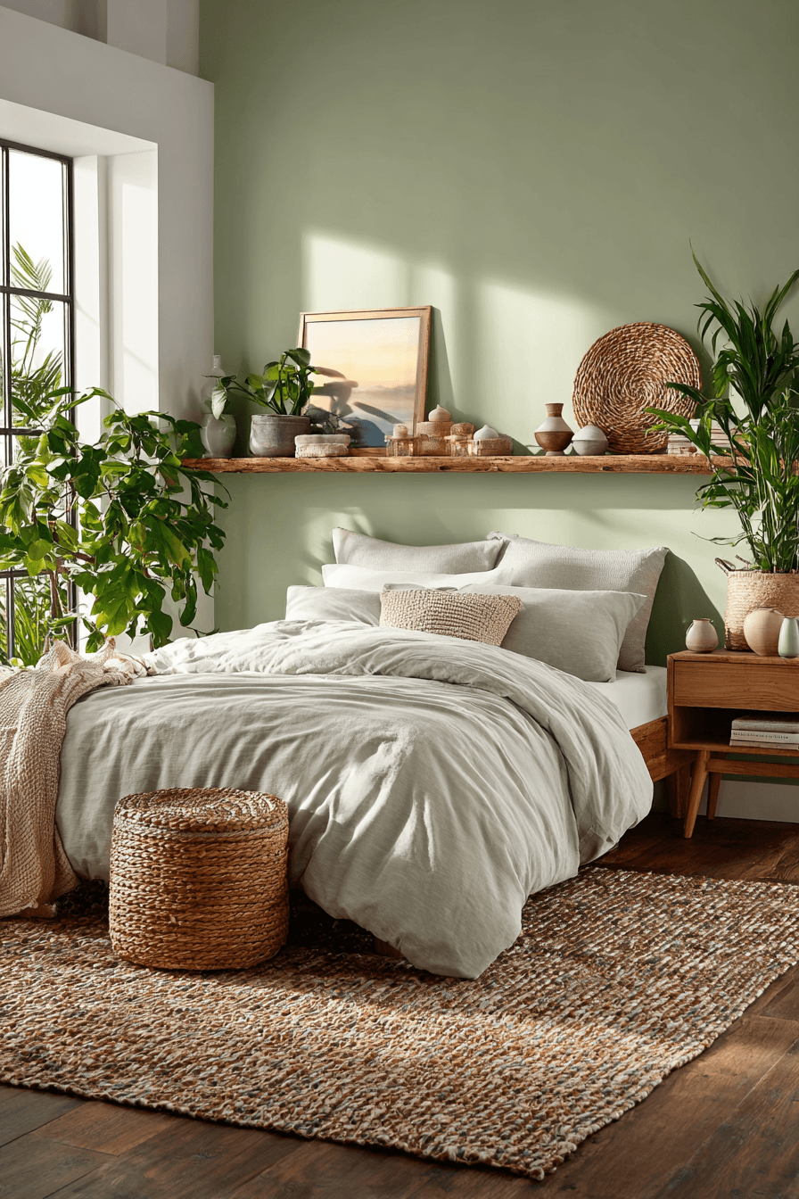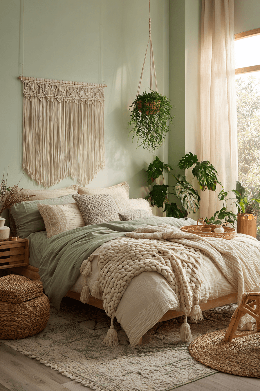 Boho styling adds a relaxed and expressive feel to a light sage green bedroom with layered textures and natural materials. Woven accents, soft fabrics, and warm tones create a lived-in vibe. Light sage green bedroom tones keep everything grounded and fresh. Decorative details add personality without clutter. The space feels creative and inviting. Add boho style to your bedroom.
