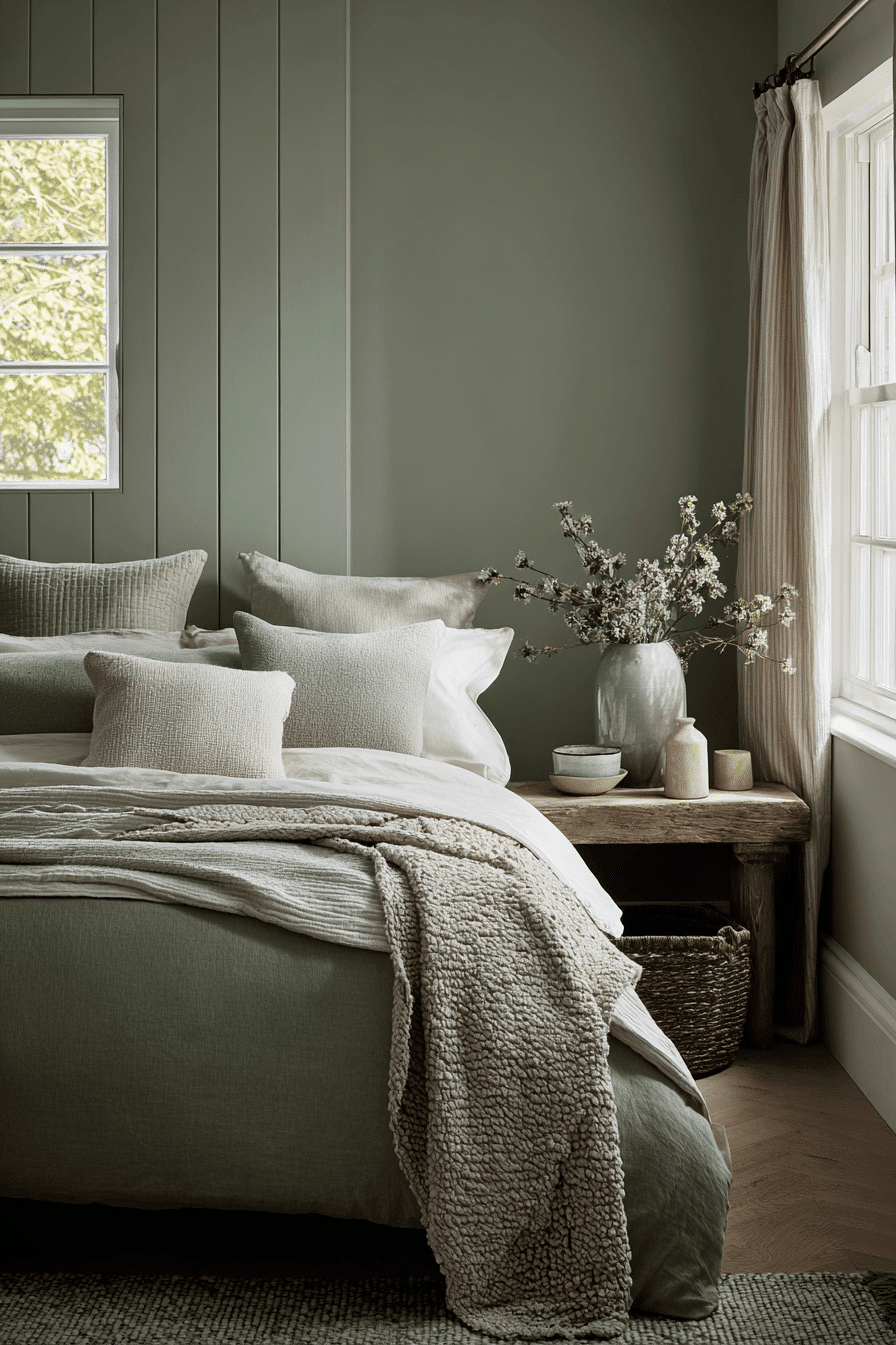 Warm neutral combinations create a cozy and grounded feel in a light sage green bedroom that feels easy to enjoy every day. Beige, sand, and soft brown tones blend naturally with sage. Light sage green bedroom palettes feel balanced and inviting. Layered textures add depth without clutter. The space feels relaxed and timeless. Add warmth with this soft palette.