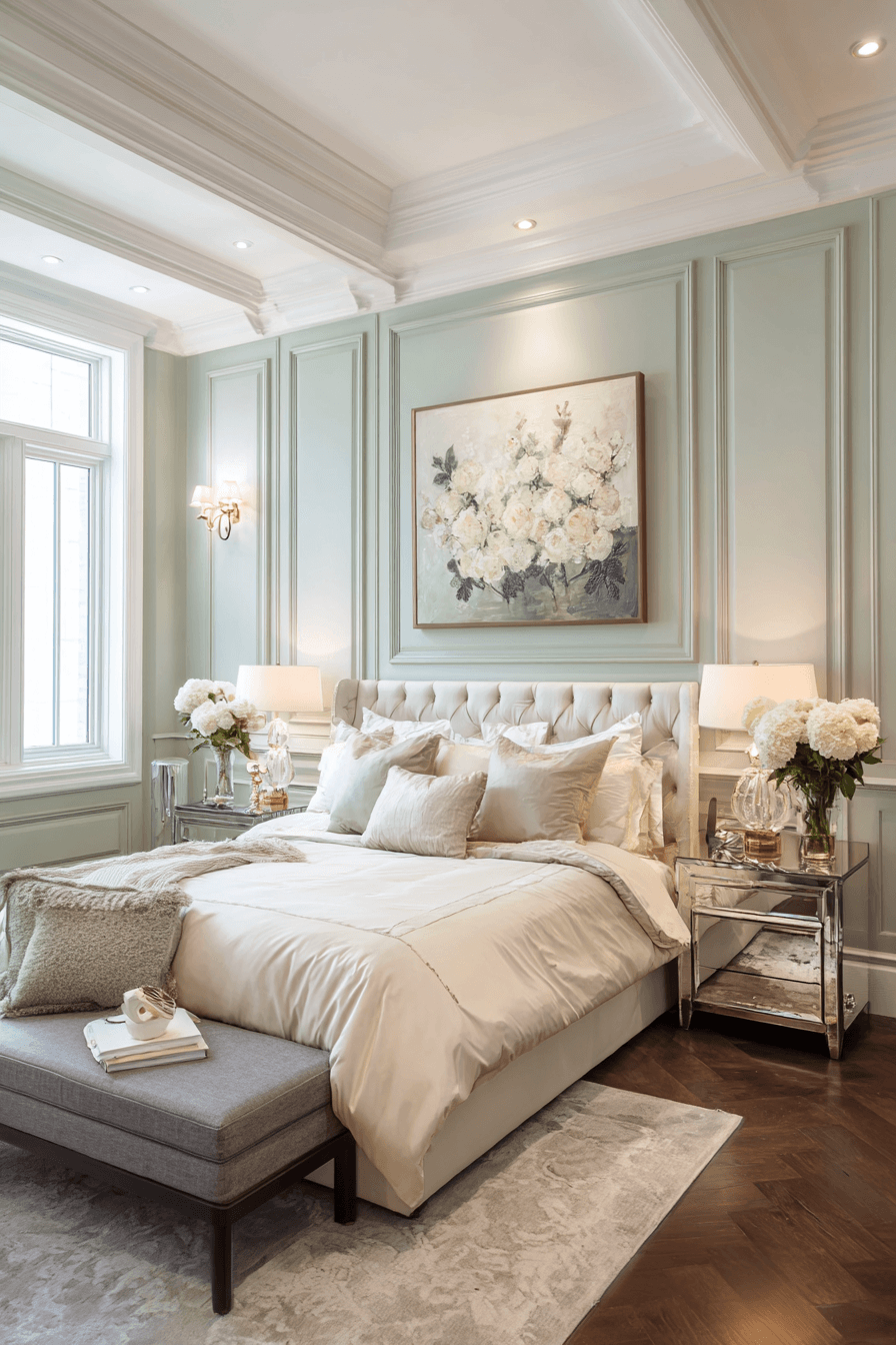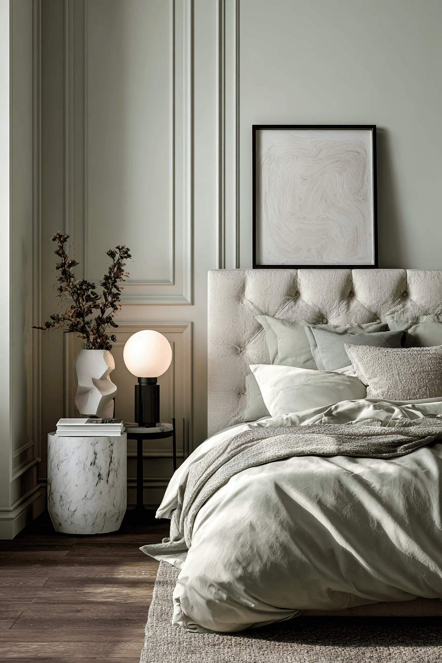 Refined details create an elegant look in a light sage green bedroom while keeping the space soft and inviting. Panel molding, mirrored accents, and warm lighting add subtle sophistication. Light sage green bedroom tones keep everything from feeling too formal. Mixing classic elements with modern touches creates a timeless design. The space feels graceful and polished. Add refined details to elevate your bedroom.