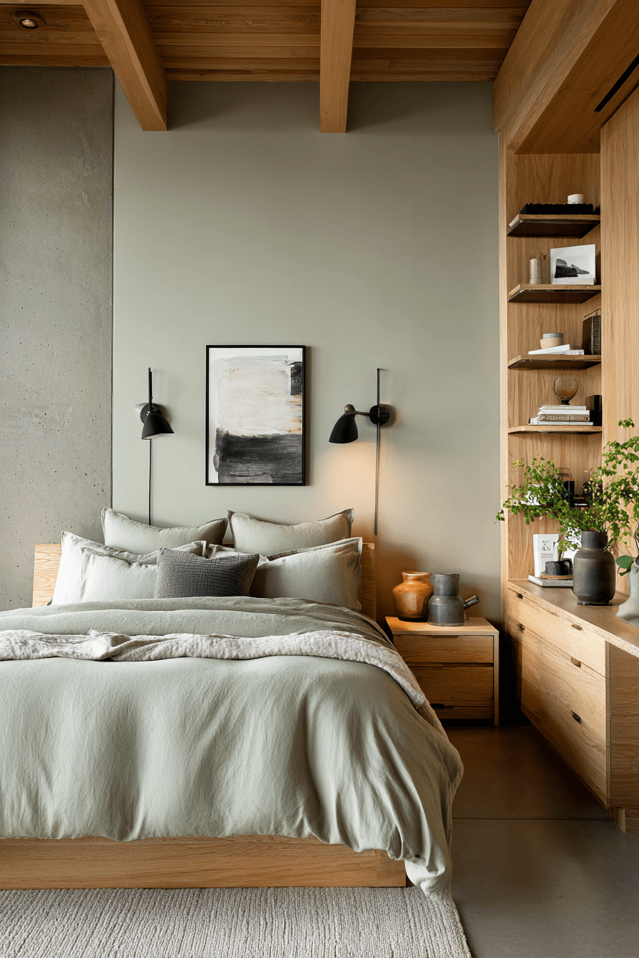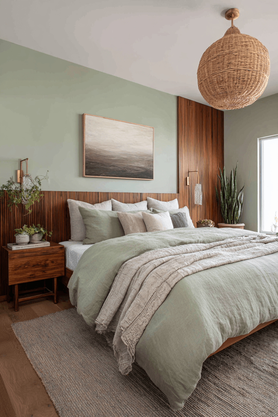 Wood accents add warmth and richness to a light sage green bedroom while keeping the look natural and balanced. Oak and walnut tones pair beautifully with sage hues. Light sage green bedroom palettes feel grounded and inviting. The combination feels timeless and easy to style. The space feels connected to nature. Add warmth with wood finishes.