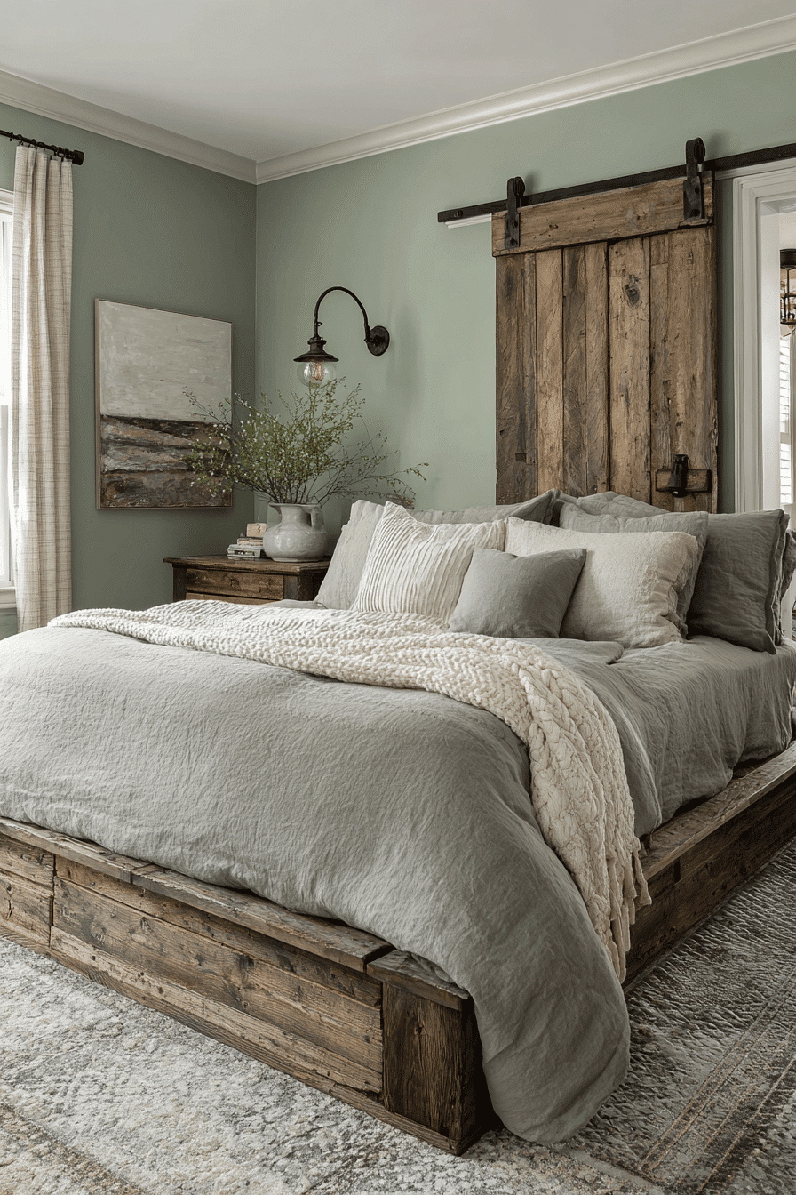Rustic elements bring charm and warmth into a light sage green bedroom through textured materials and vintage touches. Distressed wood and cozy fabrics add depth. Light sage green bedroom tones keep everything feeling fresh. The contrast feels balanced and inviting. The space feels full of character. Add rustic charm to your bedroom.