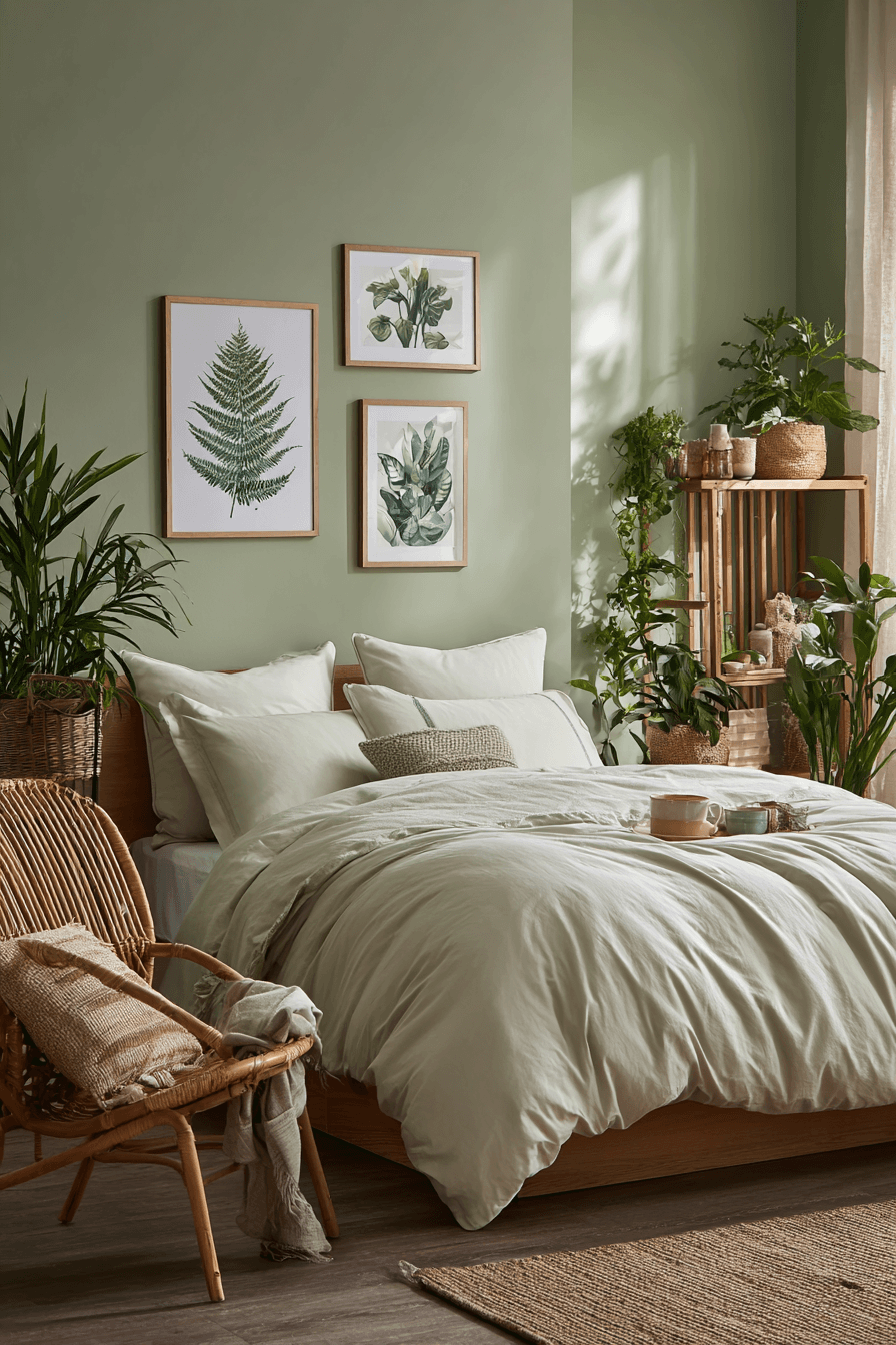 Nature-inspired design turns a light sage green bedroom into a relaxing and grounded retreat that feels connected to the outdoors. Woven rugs, linen bedding, and raw wood finishes add texture and warmth. Light sage green bedroom tones tie everything together beautifully. Plants and organic decor enhance the natural atmosphere. The space feels fresh, calm, and breathable. Bring this nature-inspired vibe into your bedroom.