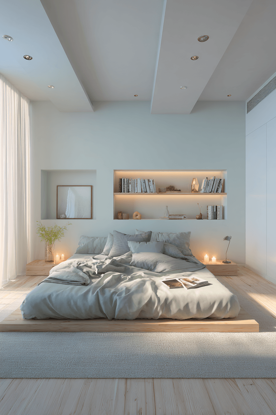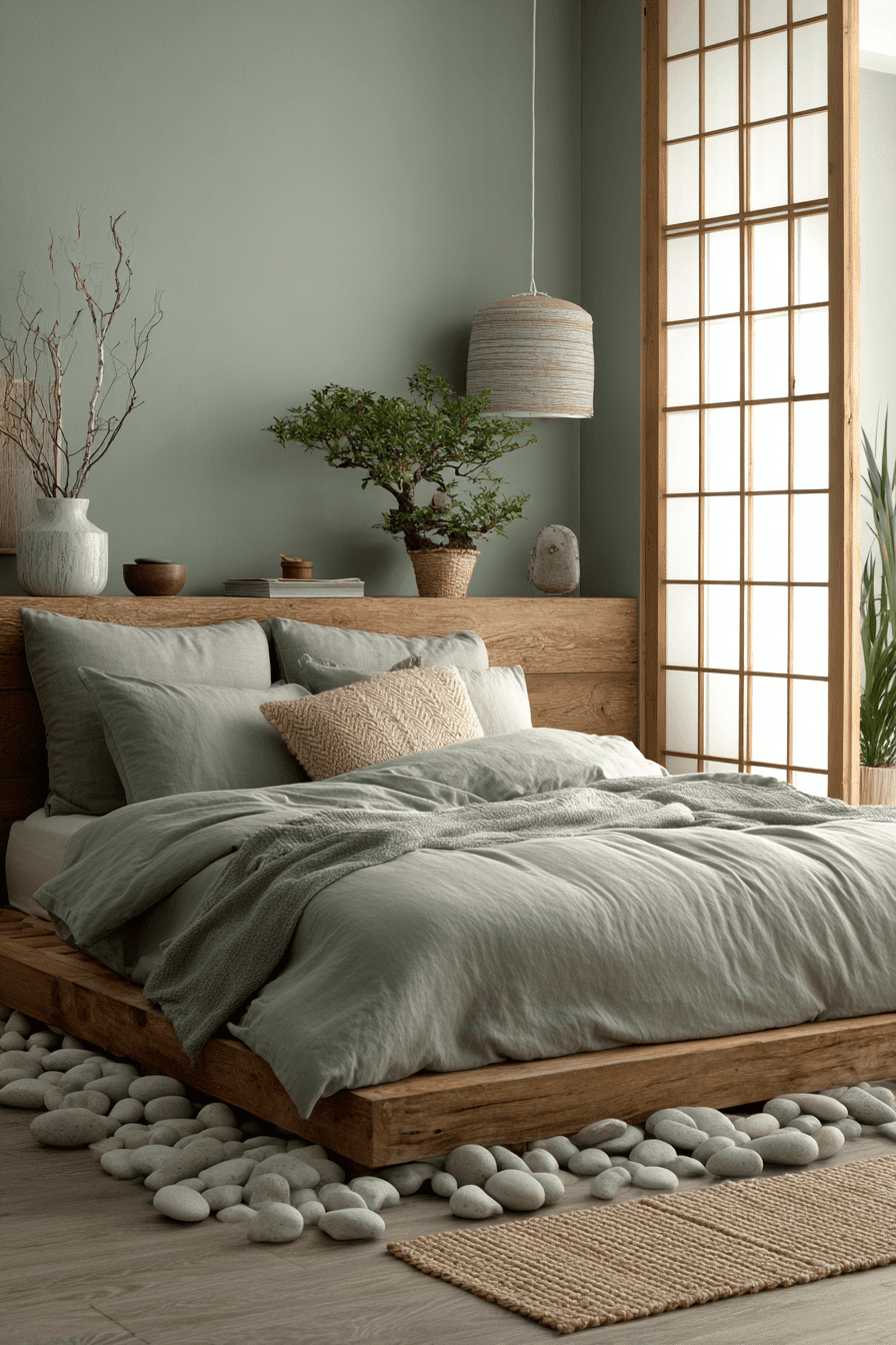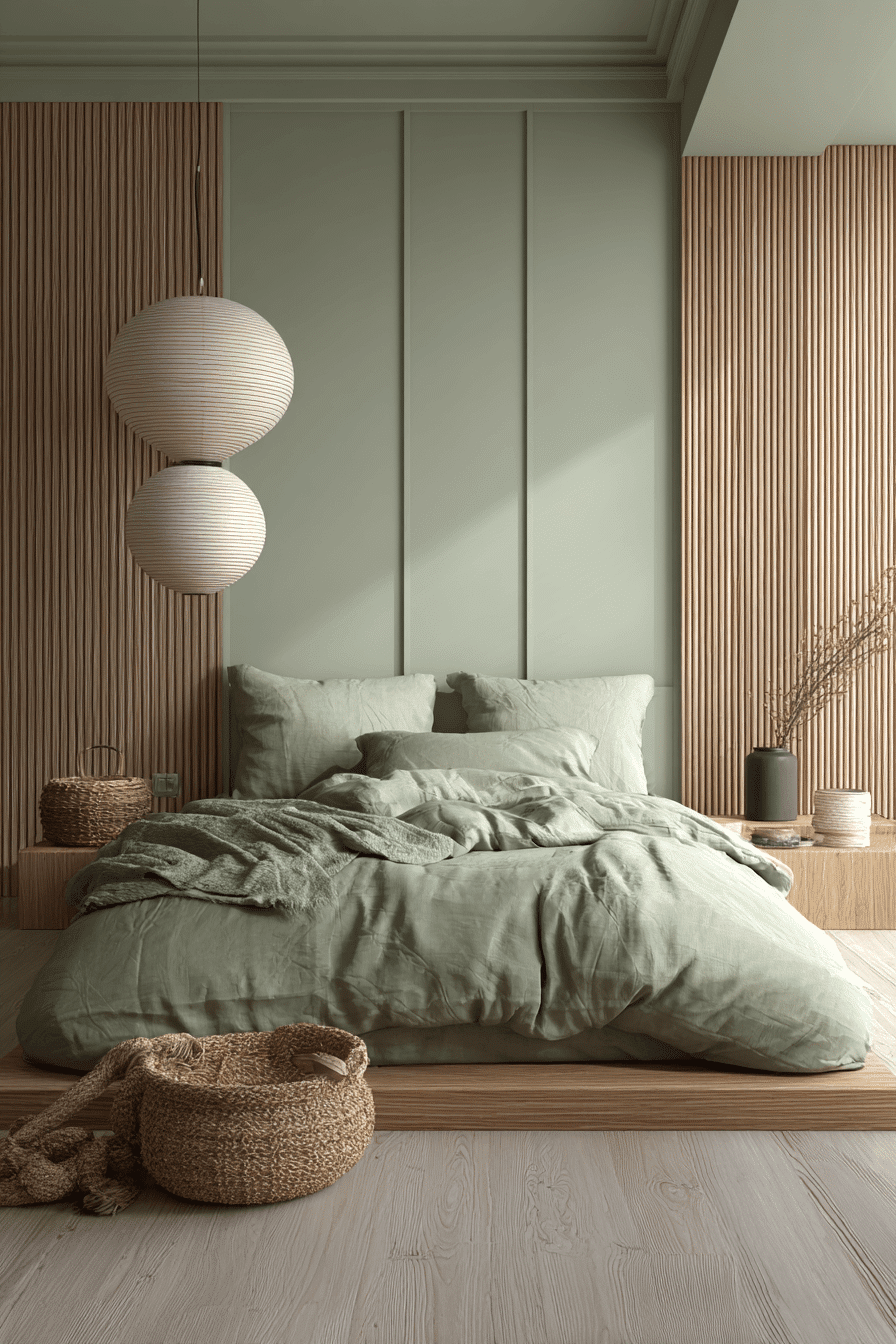 Japandi-inspired styling brings balance and simplicity into a light sage green bedroom with a calm and modern feel. Low furniture and natural wood create structure and warmth. Light sage green bedroom tones soften the minimal design beautifully. Linen textures add comfort and depth. The space feels intentional and peaceful. Bring Japandi calm into your bedroom.