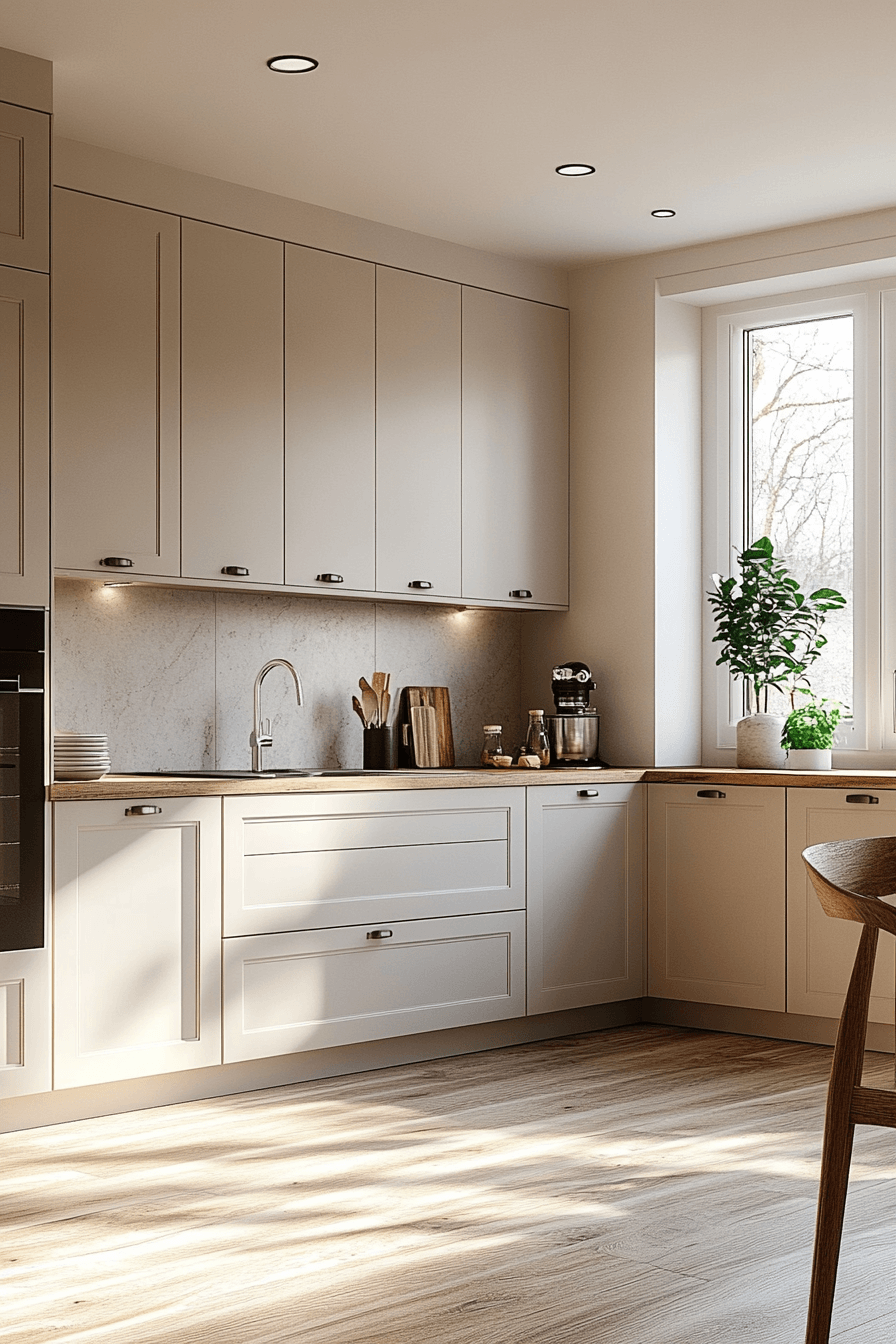 Minimal Scandinavian influence feels warmer when light taupe kitchen cabinets soften bright interiors. Clean lines and natural light define the space. Light taupe kitchen cabinets introduce comfort into the design. Wood accents enhance the cozy feel. The space feels open and welcoming. Bring warmth into minimalist living.