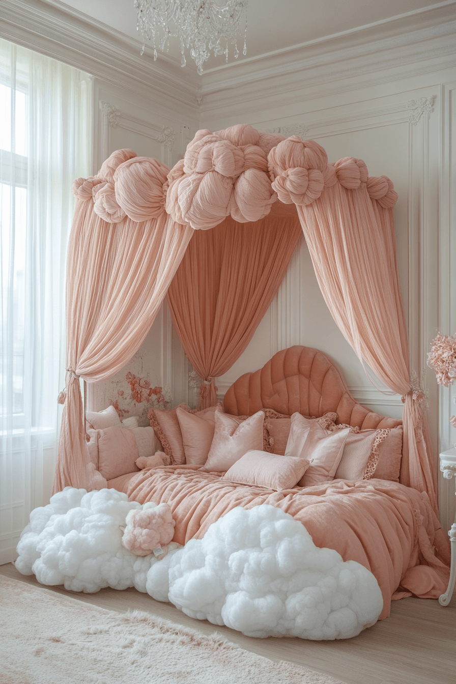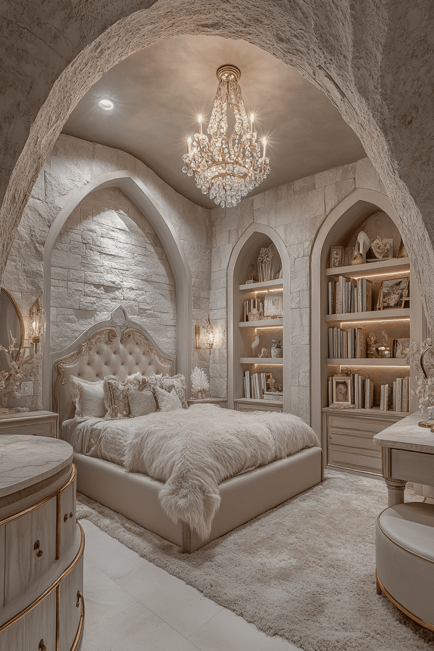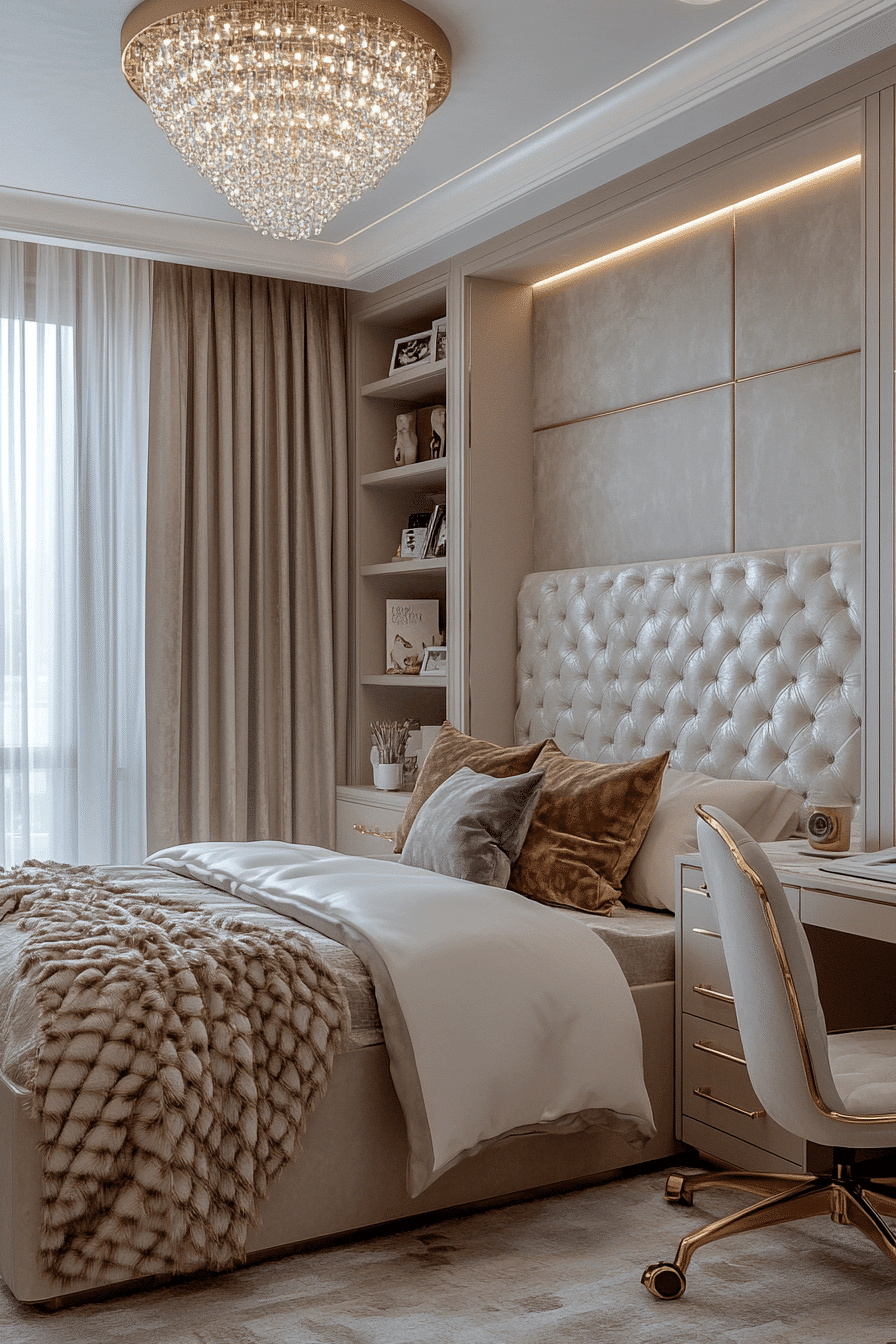 A plush-filled luxury kids bedroom can feel like stepping into the coziest cloud imaginable. Oversized padded furniture, soft rugs, and upholstered headboards wrap the room in comfort from every angle. Canopy beds and flowing fabrics add a dramatic sense of elegance that still feels warm and inviting. Crystal-style lighting and embroidered details bring in that beautiful designer finish. Every layer adds softness, richness, and a truly irresistible charm. Discover more cozy-chic inspiration and build the dreamiest retreat possible.