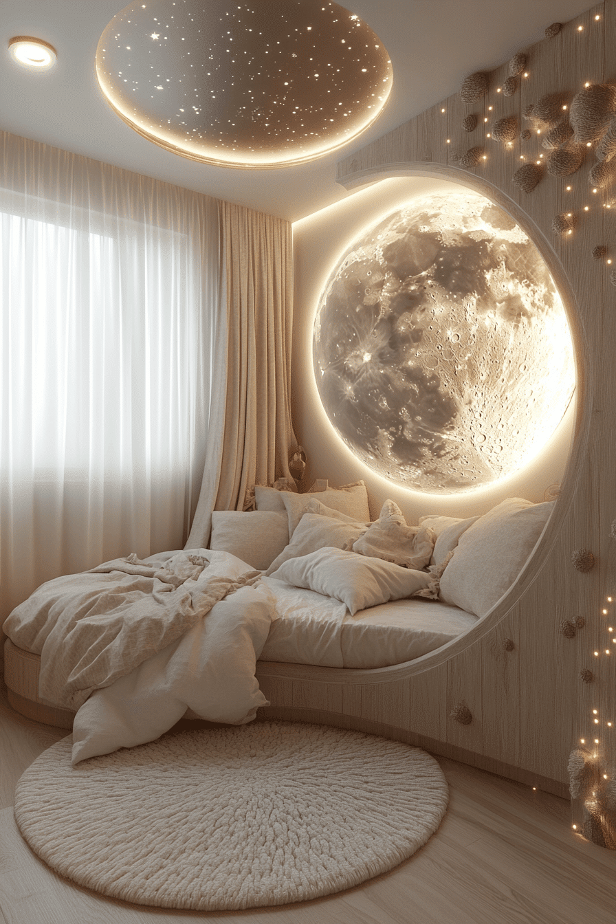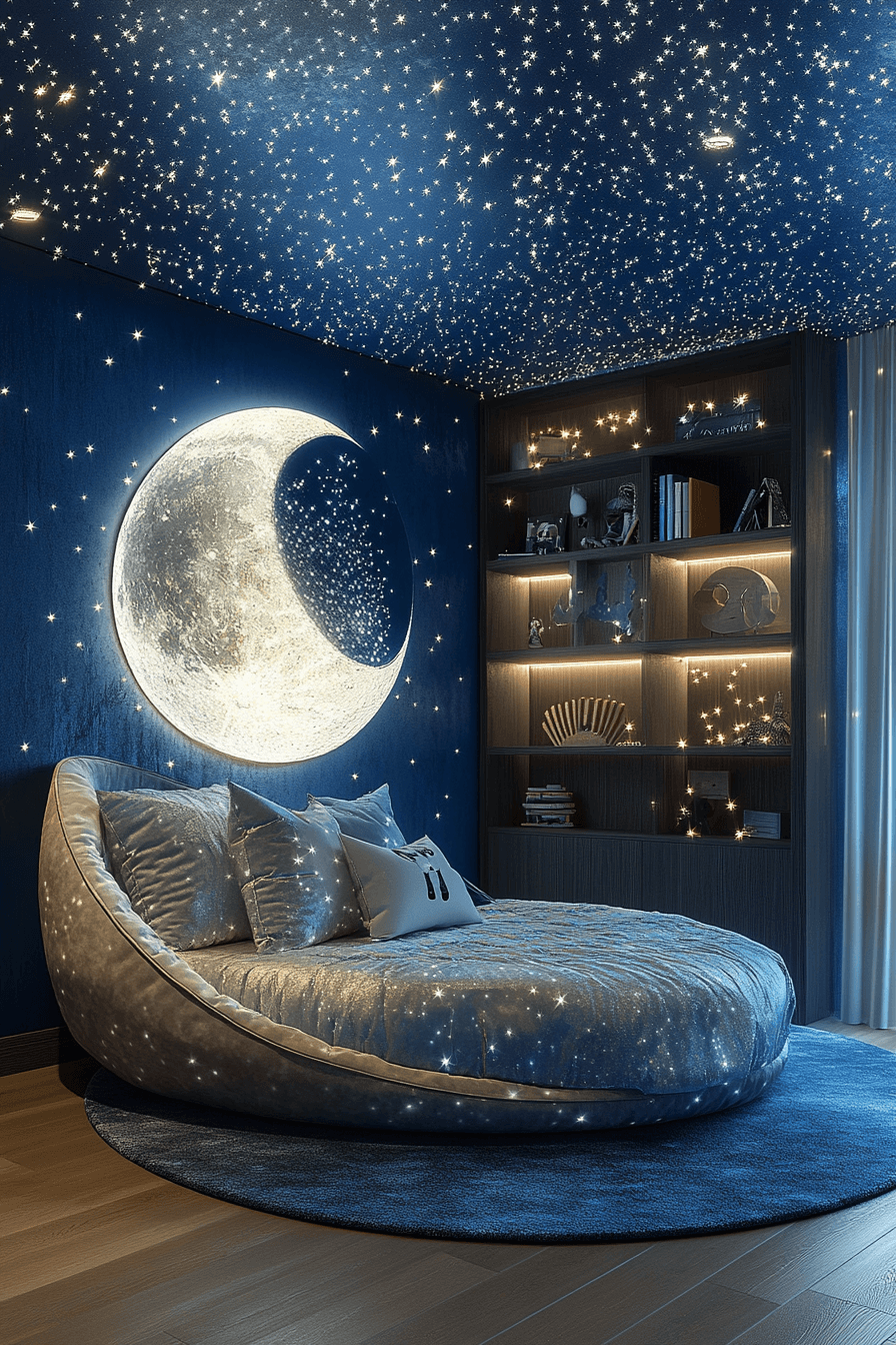 A celestial-inspired luxury kids bedroom can turn bedtime into a magical experience filled with wonder. Deep navy hues and shimmering silver touches echo the beauty of a glowing night sky. Velvet pillows, layered rugs, and soft textures add warmth and make the room feel extra inviting. Moon lamps and star-style lighting create a dreamy setting that feels both imaginative and comforting. The overall design blends bold drama with cozy elegance in the best way. Discover more starry bedroom inspiration and bring the magic home.