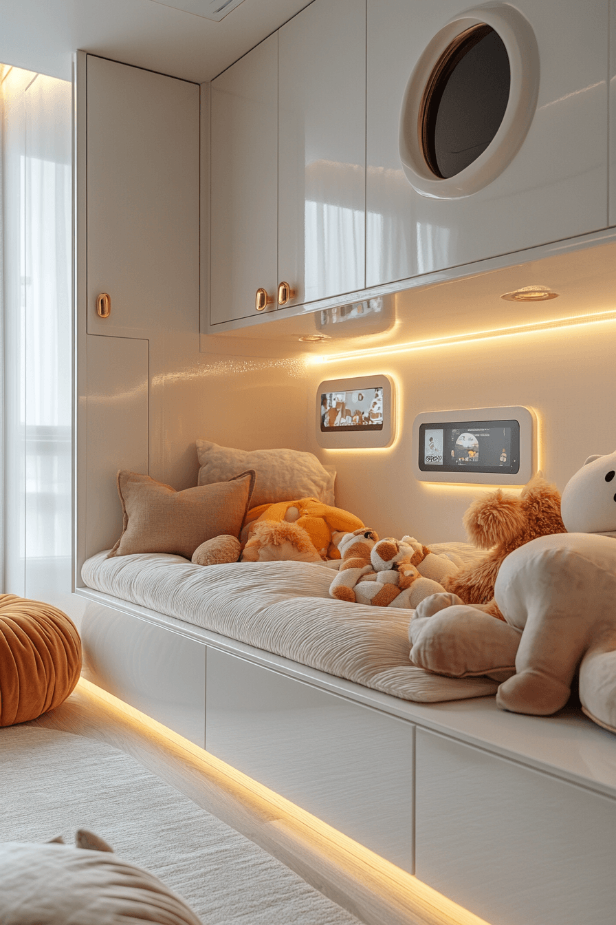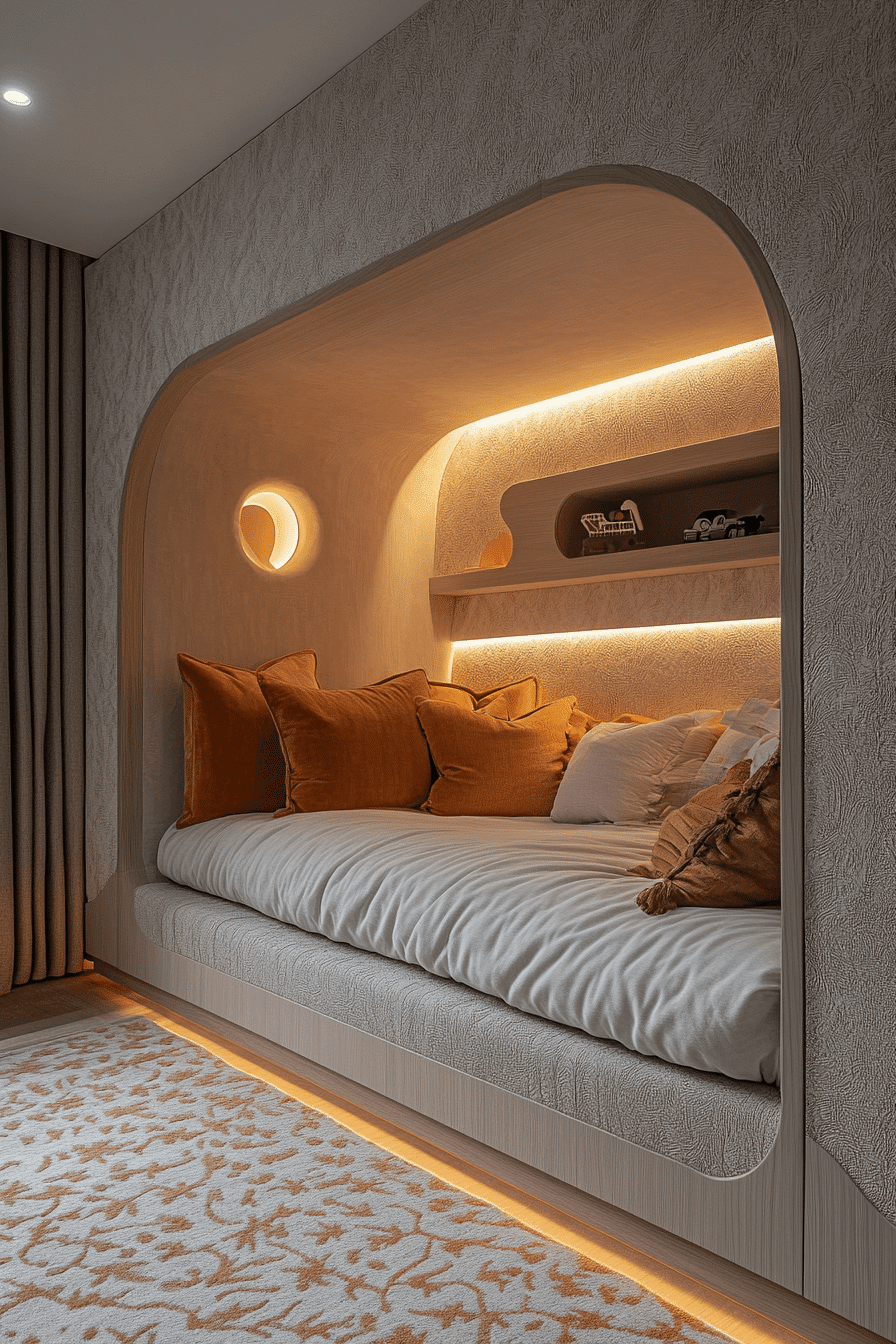 An enclosed luxury kids bedroom can feel like the perfect private retreat while still looking sleek and sophisticated. Curved sleeping spaces, statement wallpaper, and accent lighting create a cozy tucked-away mood. Neutral tones and monochrome palettes keep the room feeling calm and mature. Built-in storage helps everything stay tidy without breaking the clean visual flow. The result feels like a mini luxury suite designed especially for your child. Discover more cozy room inspiration and create a special hideaway with style.