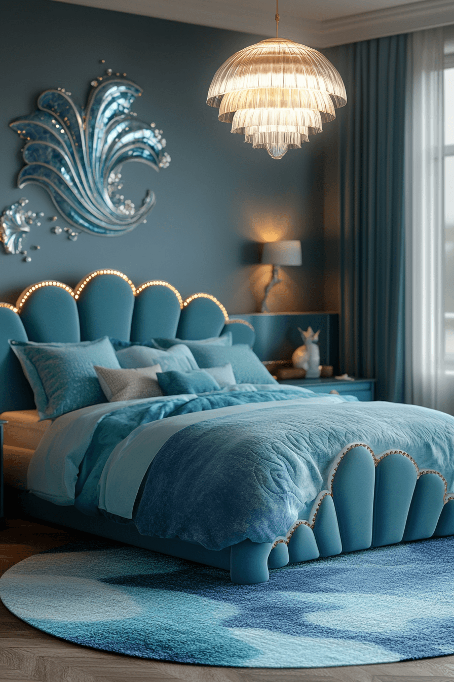 This ocean-inspired luxury kids bedroom creates a fresh and soothing retreat with upscale coastal charm. Navy, seafoam, and pearly tones bring a breezy palette that feels peaceful and bright. Wave-like patterns and soft lighting help the room feel relaxing, almost like a beautiful seaside escape. Crisp white furnishings and subtle metallic details keep everything looking polished and refined. A playful nook or swing chair adds charm without taking away from the elegance. Dive into more coastal bedroom inspiration and bring this serene style home.