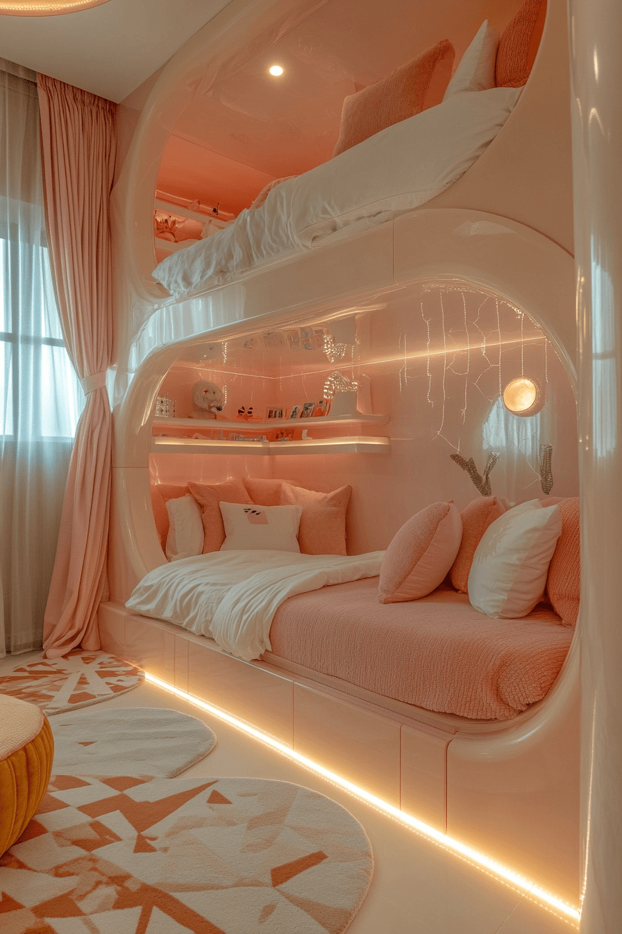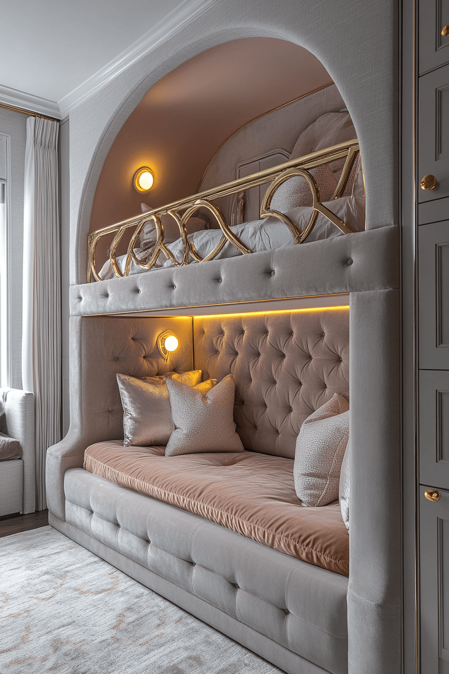 This bunk bed luxury kids bedroom gives shared sleeping space a beautiful designer upgrade. Upholstered frames, custom lighting, and curated color palettes make each level feel like its own little retreat. Built-in shelves add function while helping the design stay neat and intentional. Soft pinks, monochrome tones, or crisp whites keep the look fashionable and fresh. Special touches like velvet curtains or metallic rails elevate the entire setup. Find more stylish bunk room inspiration and transform shared spaces with flair.