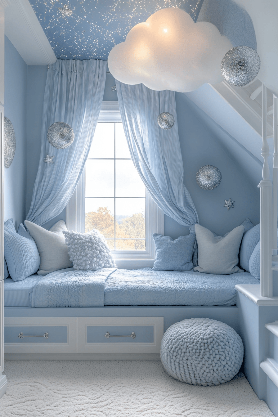 This cloud-inspired luxury kids bedroom feels soft, airy, and beautifully calming from wall to wall. Pale gray and white tones blend effortlessly with floating shelves and rounded forms. Plush fabrics and curved furniture enhance that weightless, cozy atmosphere. Gentle lighting adds a daylight-like glow that keeps the whole room feeling peaceful. Every detail feels delicate, soothing, and elevated in the loveliest way. Explore more dreamy inspiration and bring this soft cloud-like style into your home.