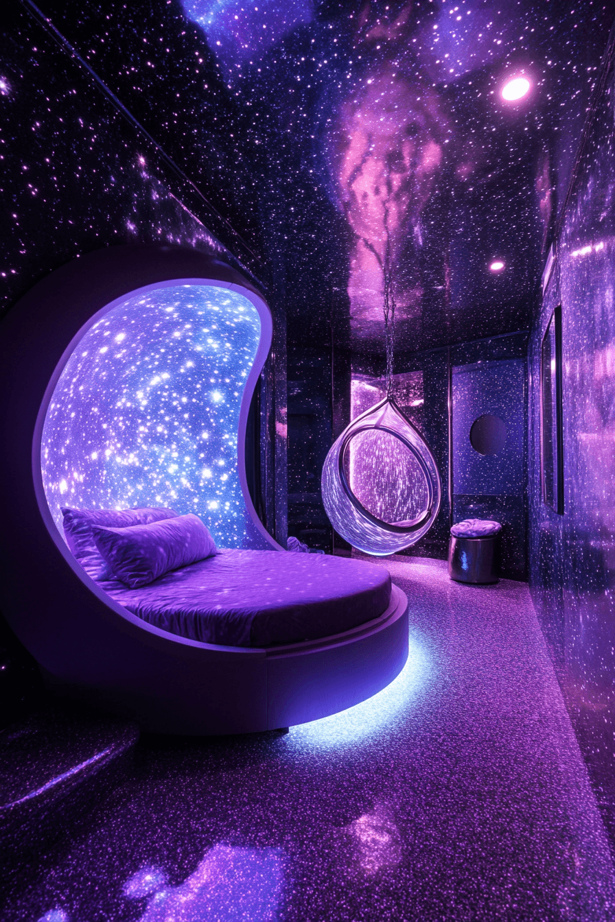 A twilight-themed luxury kids bedroom feels magical, moody, and full of cozy personality. Rich purples, deep blues, and silver details create a dreamy nighttime palette that still feels polished. Layered lighting lets the room shift easily between lively fun and quiet relaxation. Velvet textures and plush seating make every part of the room feel extra welcoming. Clean-lined furniture balances the moodier colors with a sleek, organized finish. Explore more dreamy room inspiration and create a magical retreat today.