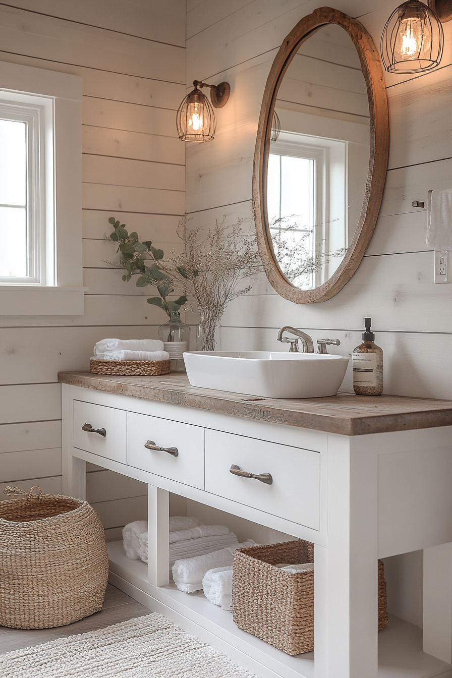 This bathroom showcases a charming modern farmhouse interior with its shiplap walls and warm wooden accents. The soft lighting and natural elements create a cozy space for relaxation. It perfectly blends style and comfort, making it an inviting retreat.