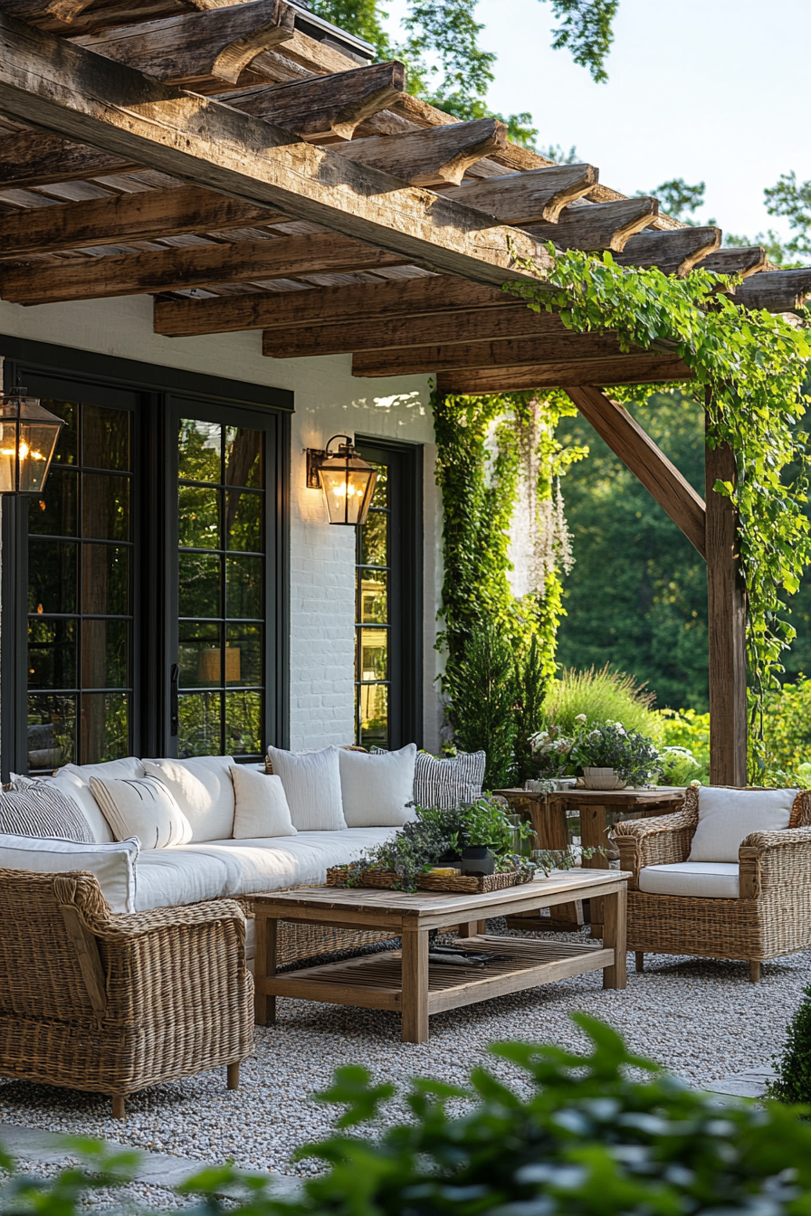 This outdoor space perfectly blends comfort and style. The modern farmhouse interior shines through with cozy seating and natural elements. Surrounded by greenery, it’s a great spot to relax or entertain friends.