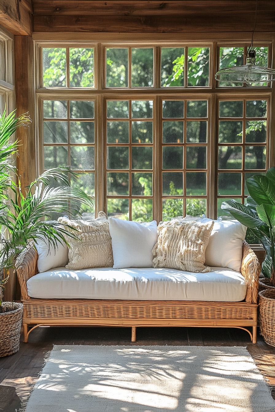 This sunroom is a perfect blend of vintage charm and modern farmhouse interior. The warm light streaming through the windows highlights the cozy seating and lush greenery. It’s an ideal spot to relax, read a book, or enjoy your morning coffee.