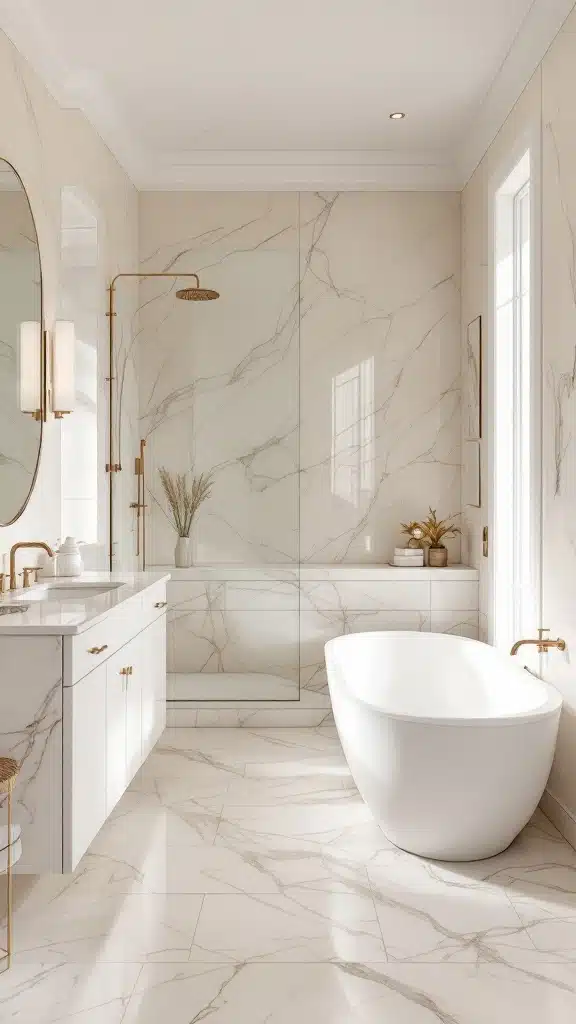 Classic Marble Elegance transforms bathrooms into serene retreats with soft beige or white marble accents. The natural veining of marble adds understated texture, creating a perfect balance of luxury and tranquility. Countertop vanities, wall tiles, or a statement bathtub headline this timeless design.