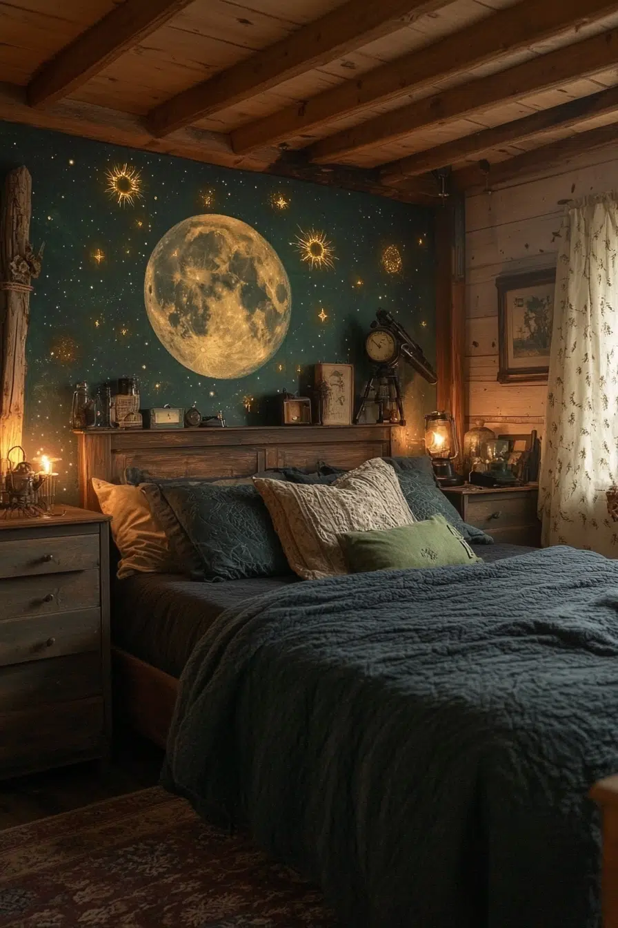 Unveil the Cosmic Spell Space, your rustic boho witchy bedroom with a celestial mural for an otherworldly feel. Combine rustic furniture with starry bedding and galaxy drapes for a magical touch. Add globes and star sculptures to enhance the theme of cosmic exploration.