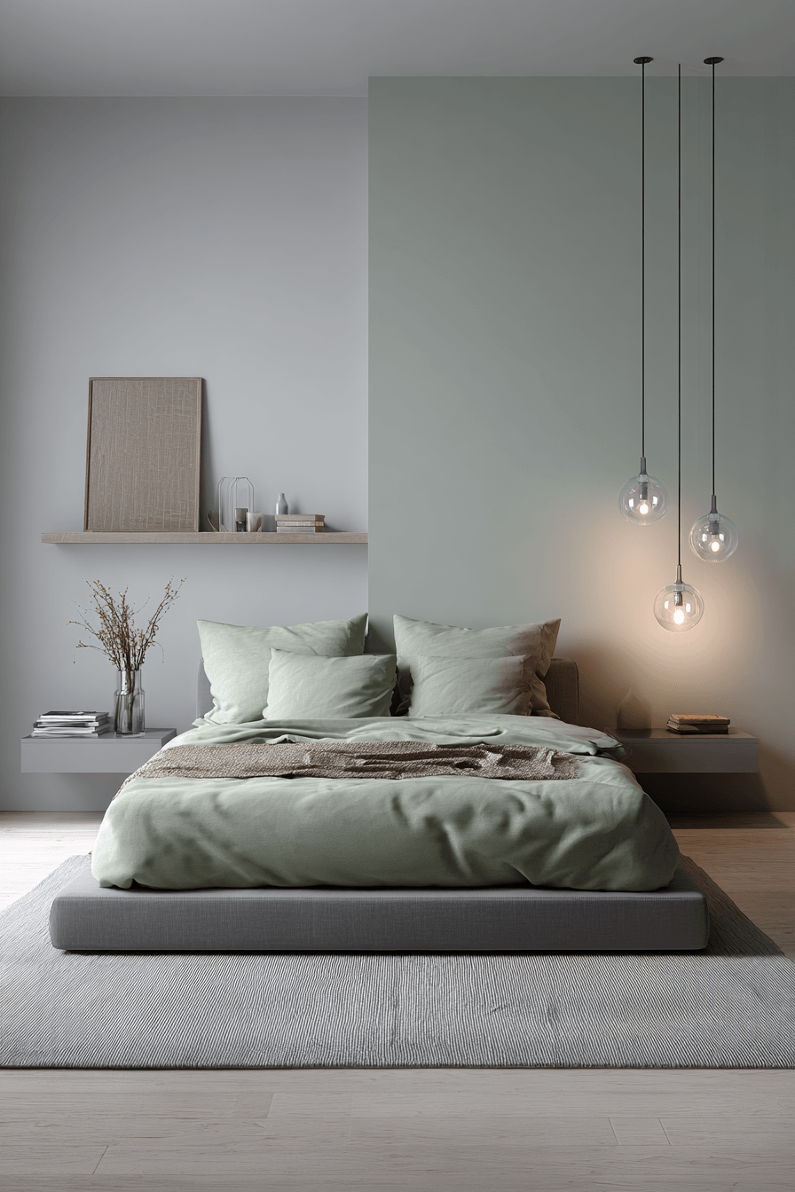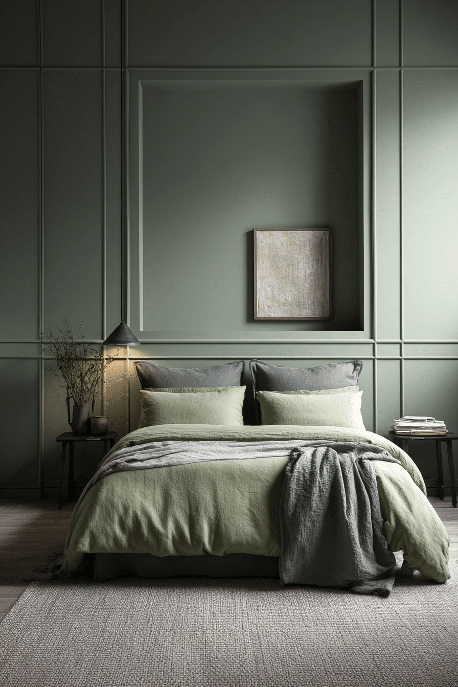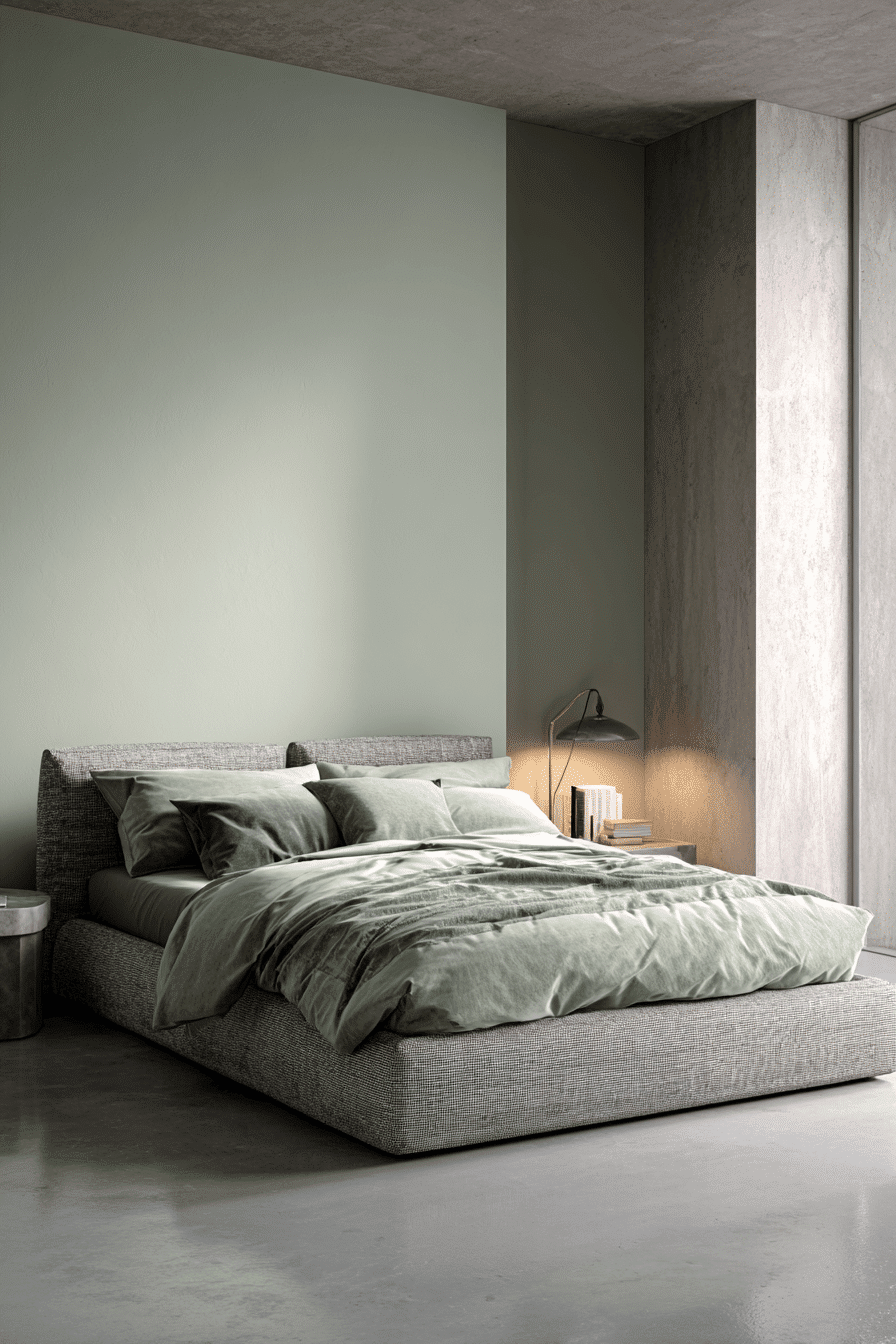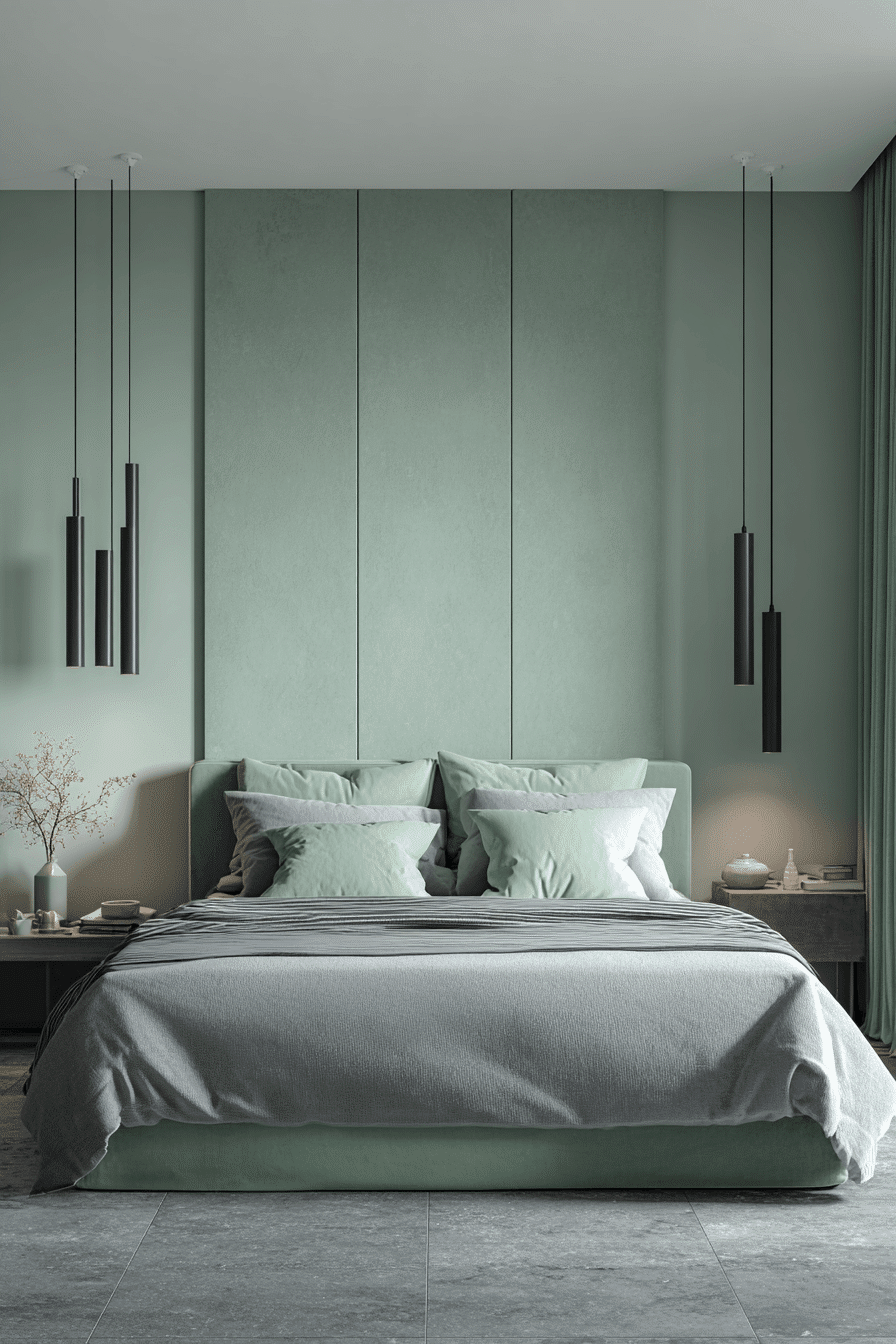 Slate-inspired grey can give the room stronger lines and a more architectural finish. A sage green and grey bedroom feels especially polished when pale sage walls are paired with slate bedside tables, bed frames, or structural accents. The deeper grey sharpens the space, while sage keeps everything from feeling too rigid. Layered lighting helps each tone look fuller and more refined. The final effect is crisp, balanced, and confidently modern. Bring this structured palette into your room and enjoy the tailored feel.
