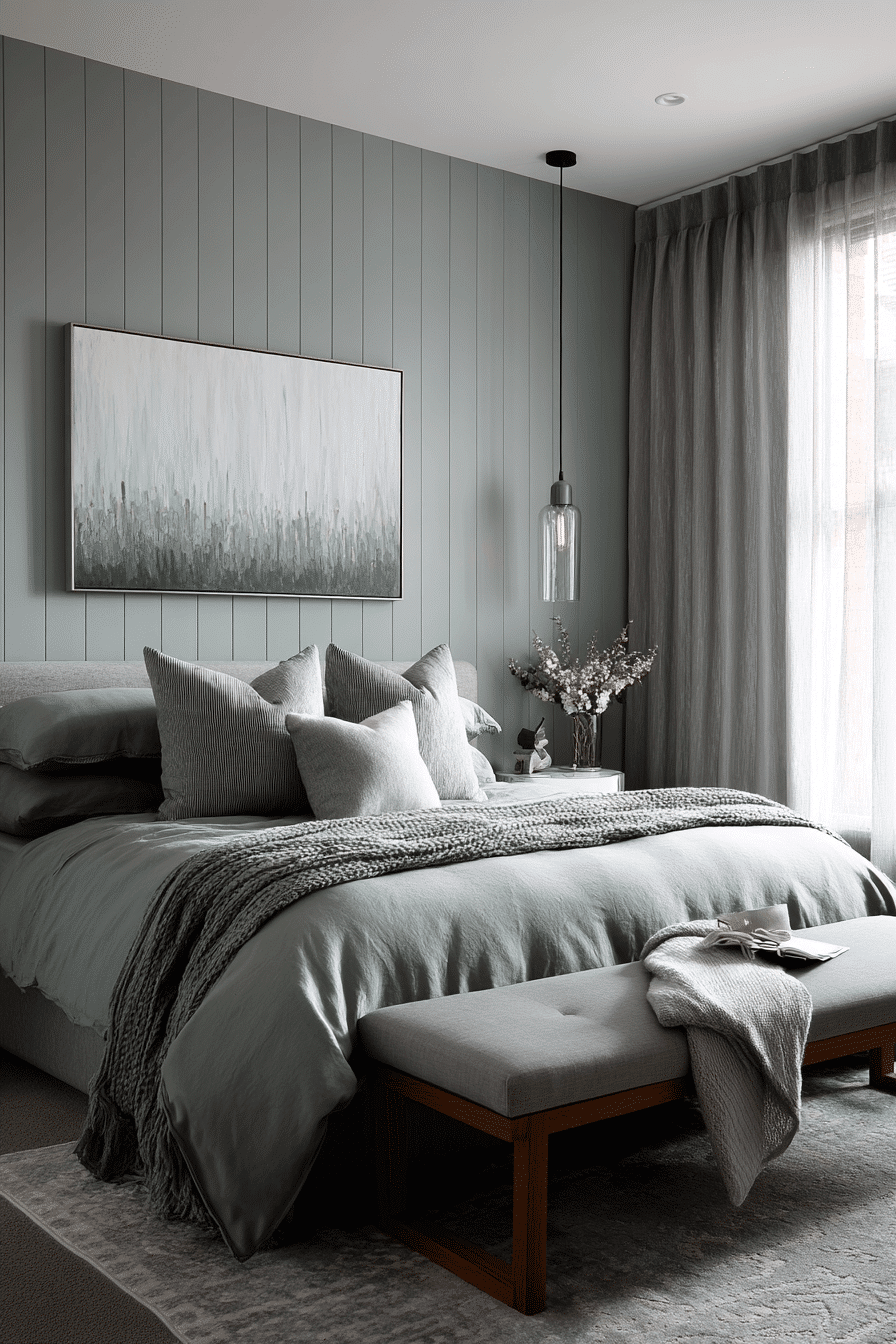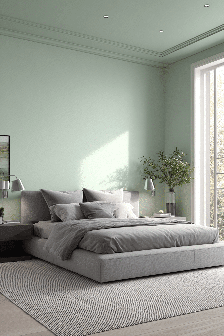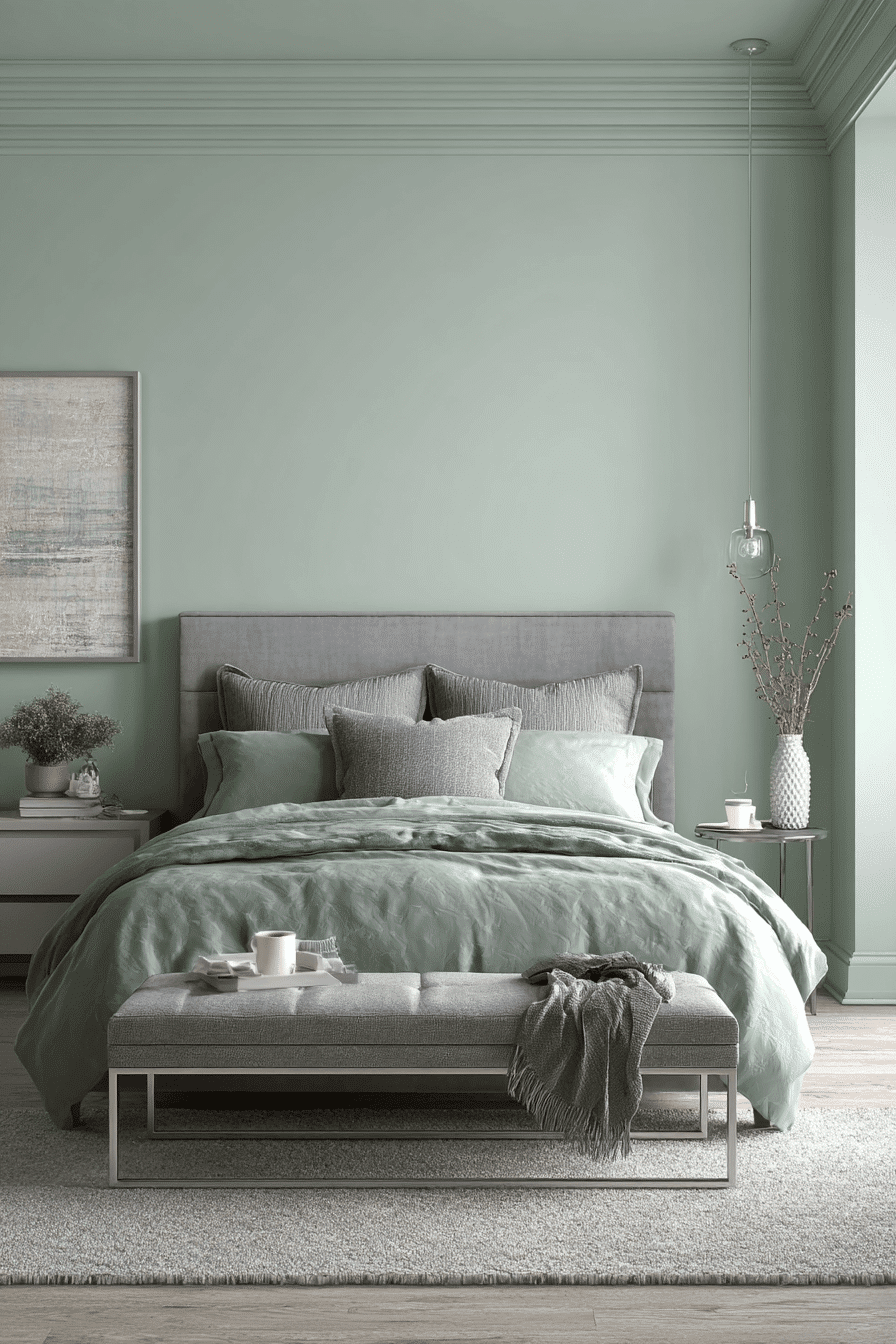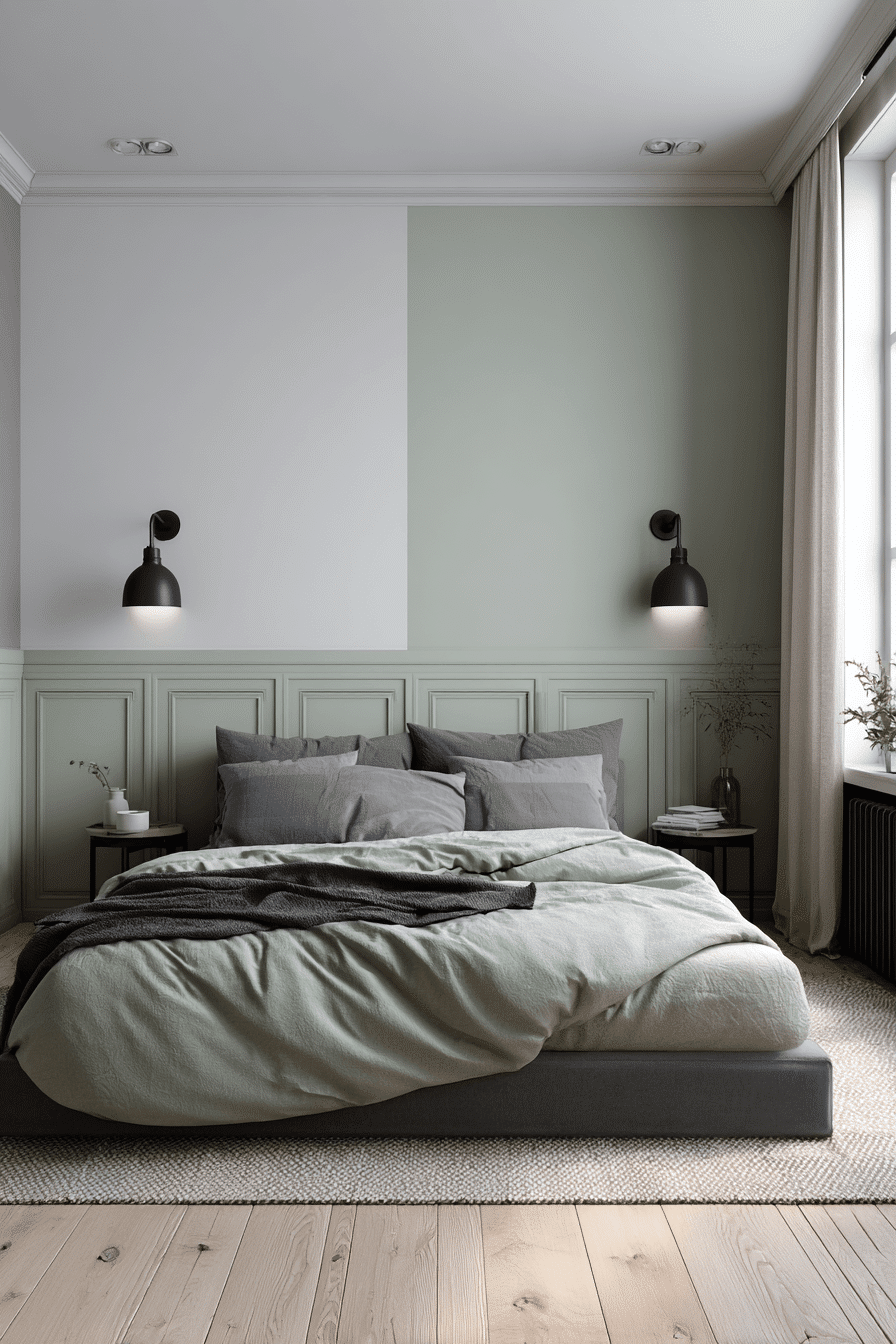 Slate-inspired grey can give the room stronger lines and a more architectural finish. A sage green and grey bedroom feels especially polished when pale sage walls are paired with slate bedside tables, bed frames, or structural accents. The deeper grey sharpens the space, while sage keeps everything from feeling too rigid. Layered lighting helps each tone look fuller and more refined. The final effect is crisp, balanced, and confidently modern. Bring this structured palette into your room and enjoy the tailored feel.