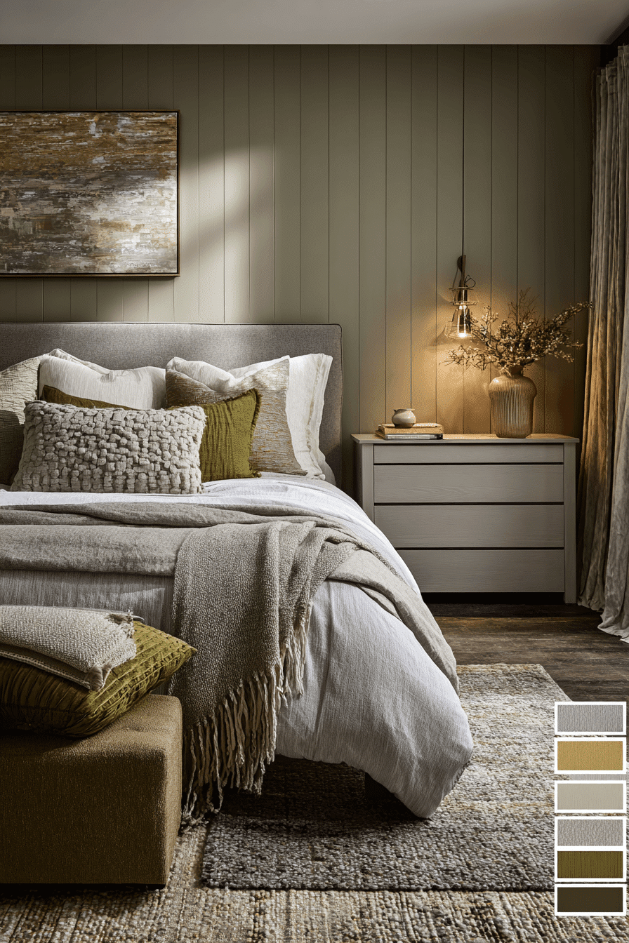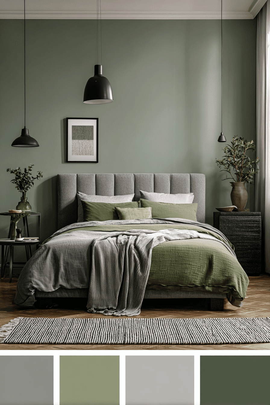 Color balance is what gives this palette such a graceful and finished quality. A sage green and grey bedroom looks cohesive when sage softens the room and grey adds just enough definition to keep everything feeling polished. Repeating both shades through textiles and furniture helps the whole space feel connected. Simple patterns let the colors stay in focus without creating clutter. The final design feels calm, refined, and very intentional. Recreate this balanced look and enjoy the harmony it brings.