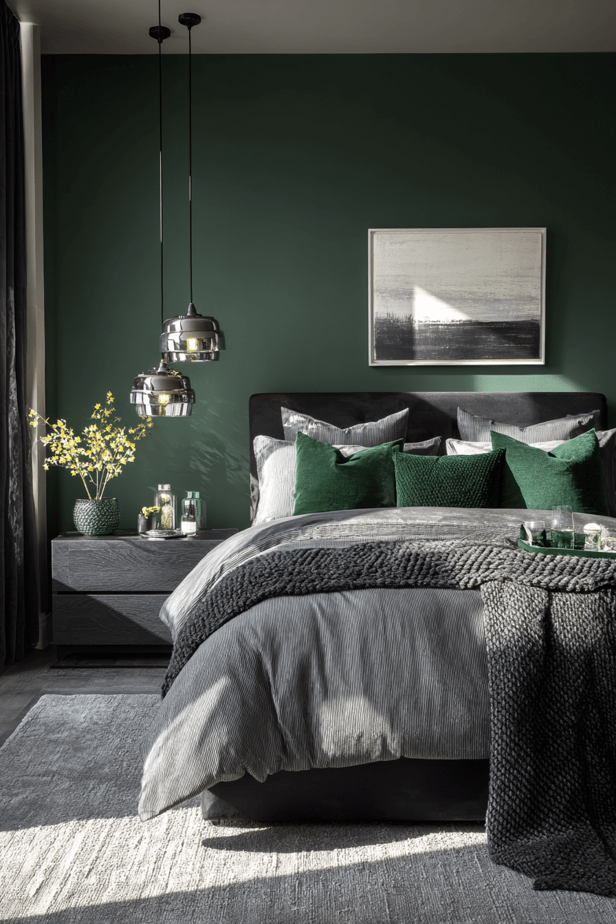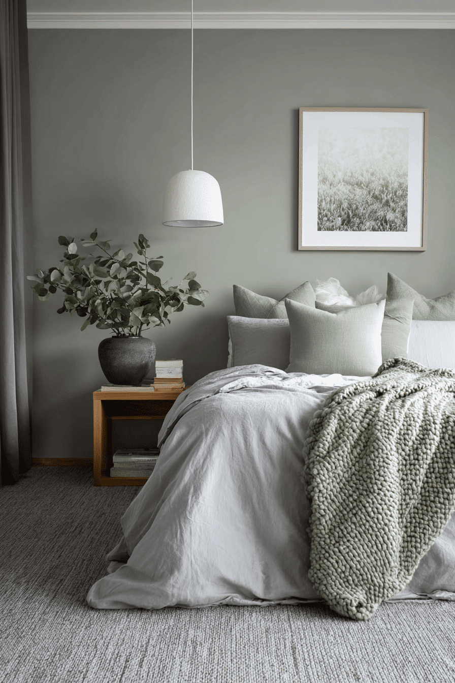 Soft materials can make this pairing feel almost cloudlike and incredibly peaceful. A sage green and grey bedroom becomes more restful when plush grey bedding, muted green walls, and low-profile furniture are combined with gentle lighting. The palette stays light enough to feel open while still offering depth. Nothing feels overly styled, yet the room feels complete. The mood is dreamy, quiet, and perfect for rest. Create this soft atmosphere and turn your bedroom into a calming escape.