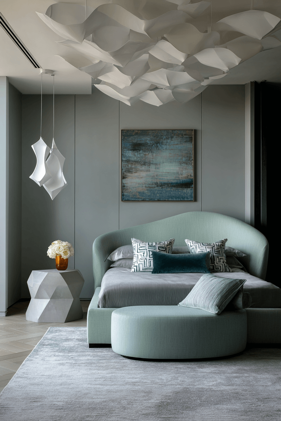 Curved shapes can make this palette feel softer, more artistic, and more memorable. A sage green and grey bedroom becomes more design-forward when sculptural chairs, rounded lamps, or softly contoured furniture are added to the space. Grey gives these shapes a strong visual anchor, while sage creates an easy, calming backdrop. The interaction between form and color makes the room feel thoughtfully styled. The result is modern, creative, and still very restful. Add sculptural details and bring more personality into your bedroom.