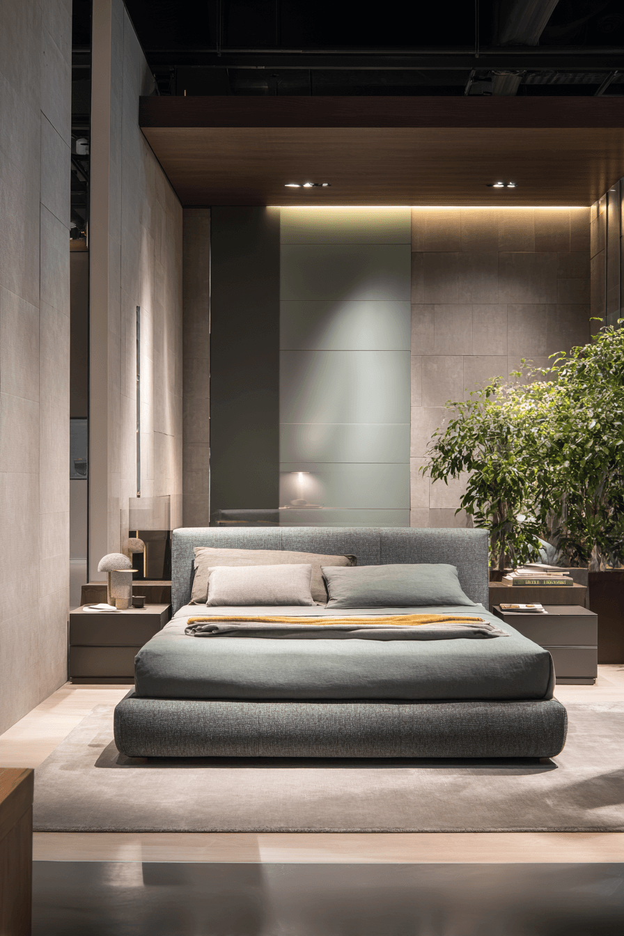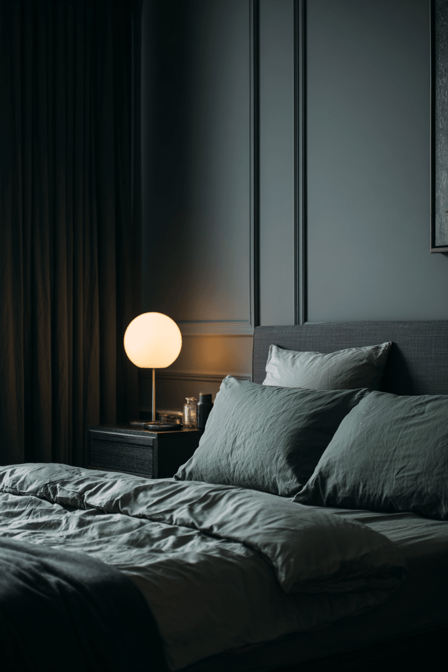 A moodier take on this palette can make the bedroom feel cocooning and full of depth. A sage green and grey bedroom becomes especially atmospheric when darker greys, matte finishes, and plush fabrics are softened by gentle sage walls or accents. Warm low lighting keeps the room cozy instead of cold. The contrast feels intimate, stylish, and easy to unwind in. Everything feels controlled without feeling severe. Explore this deeper version and create a bedroom with more character.
