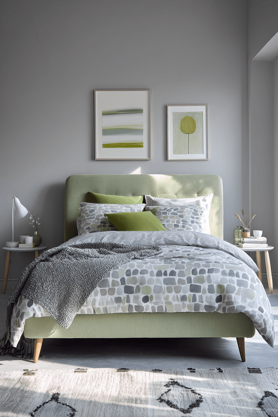 Subtle pattern and shape can make this palette feel more alive while preserving its calm. A sage green and grey bedroom feels more dynamic when geometric bedding, curved decor, or soft graphic elements are added in controlled doses. Grey helps define those shapes, and sage keeps them from feeling too sharp. Clean layouts maintain the polished mood. The result is modern, rhythmic, and quietly expressive. Add these geometric touches and give your bedroom a refined sense of movement.