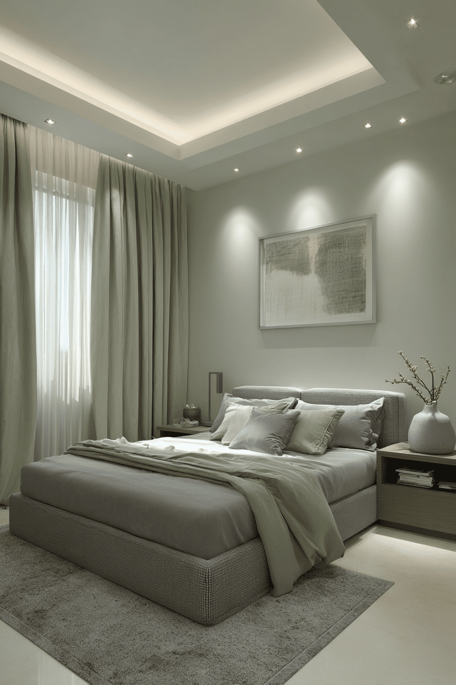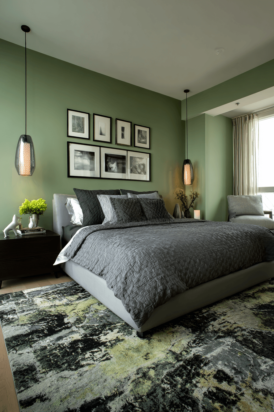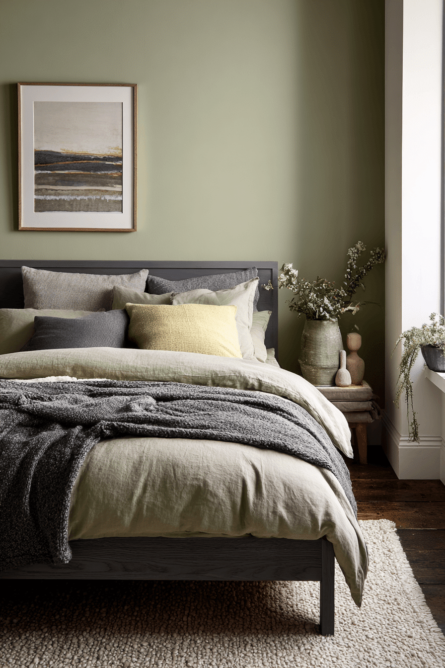 Light and dark contrast can create just enough drama to keep the room visually fresh. A sage green and grey bedroom feels more striking when pale sage walls are paired with deeper grey textiles or furniture. The shift in tone adds depth and energy without disturbing the calm mood. Minimal accessories allow the contrast to remain the focal point. The room feels bold, modern, and beautifully restrained. Try this contrast-driven style and give your bedroom a confident refresh.