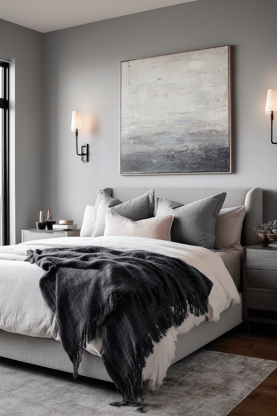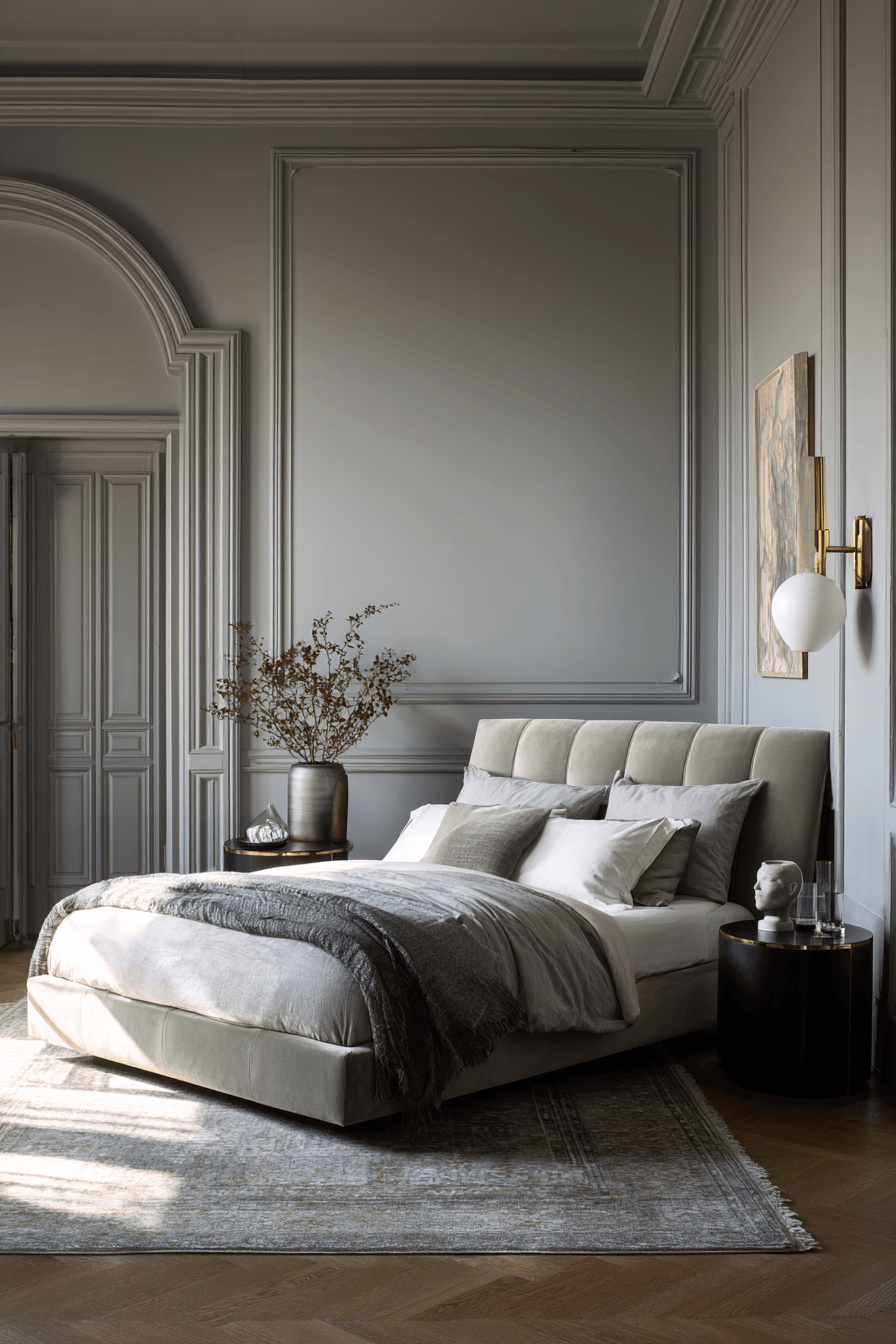 Light grey can act as a beautiful backdrop for a softer and more peaceful bedroom. A sage green and grey bedroom looks especially airy when pale grey walls frame sage bedding and a smooth upholstered headboard. Layered lighting and plush textures make the room feel even more inviting. The palette stays calm and bright without becoming bland. The final atmosphere is restful and easy to love. Create this airy retreat and enjoy the softness it brings.