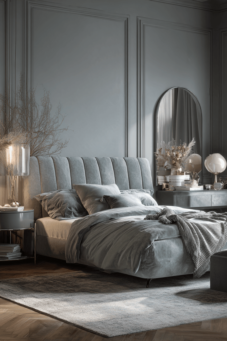 Surface variety can make the palette feel far more elevated and interesting. A sage green and grey bedroom becomes richer when glossy grey pieces are paired with velvety sage fabrics, soft weaves, and other tactile finishes. The contrast comes through light, texture, and sheen as much as through color. That combination adds depth without clutter. The room feels quietly luxurious and very refined. Explore this textural styling and enhance your bedroom beautifully.