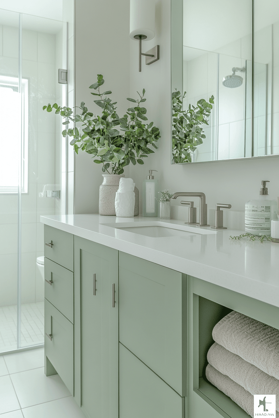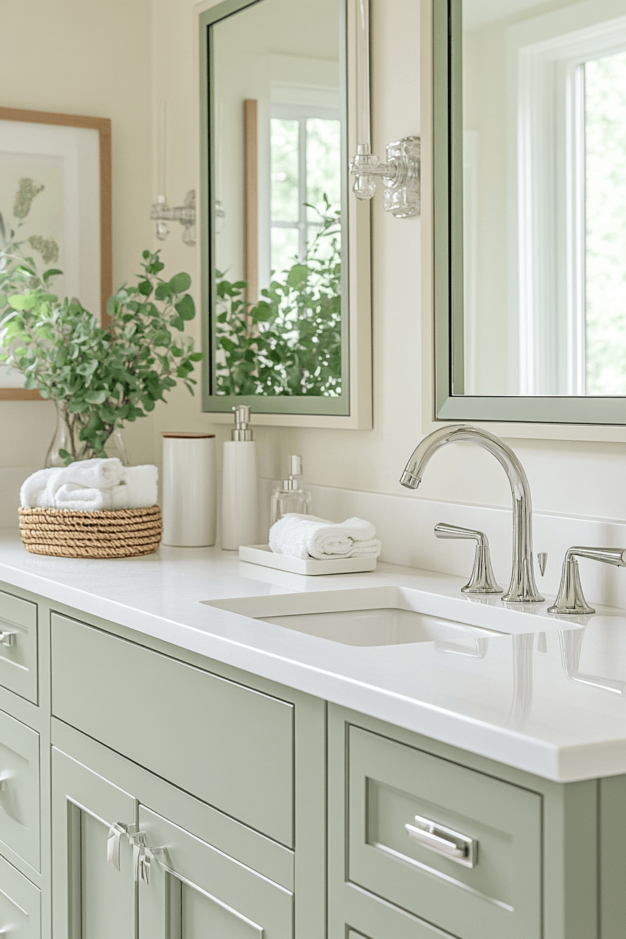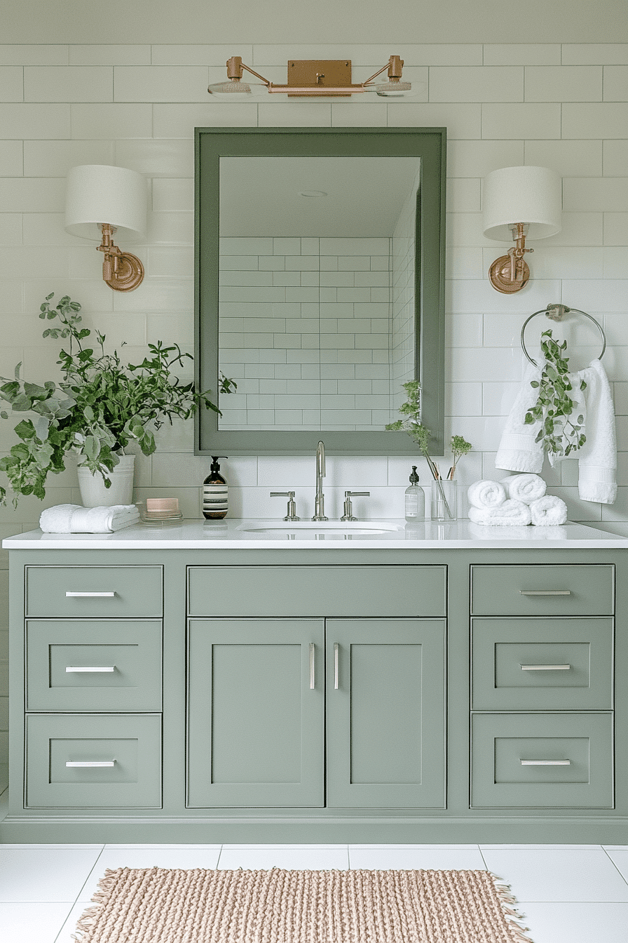 Simple shapes can feel far more welcoming when the palette is softened by the right tones. A sage green and white bathroom looks especially current when streamlined cabinetry, frameless mirrors, and minimal fittings are paired with soft green accents and bright white finishes. White brings the clean structure, while sage prevents the room from feeling too stark. The overall design feels polished without becoming cold. Every line looks intentional and easy to live with. Refresh your bathroom with this modern softness and enjoy the result.