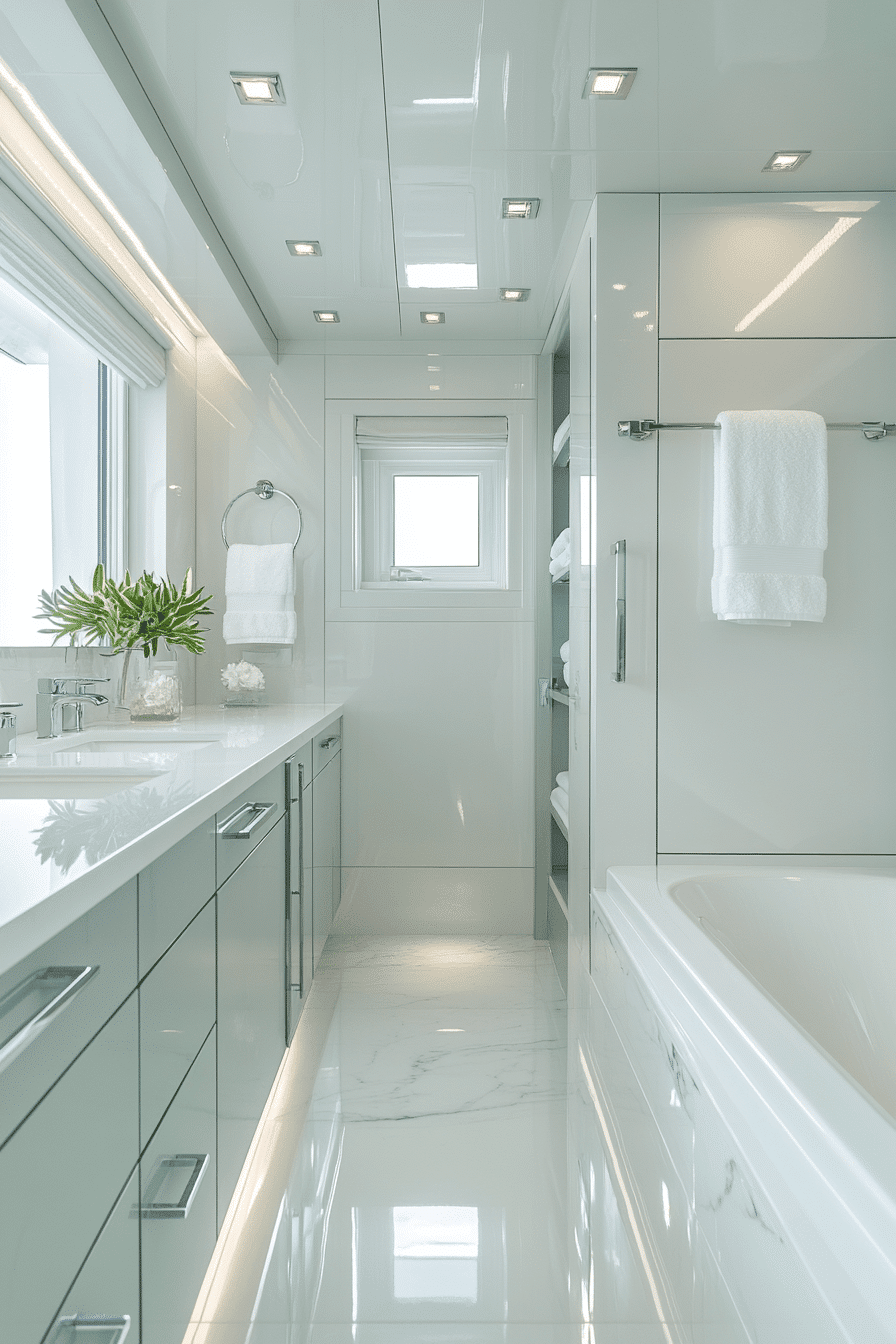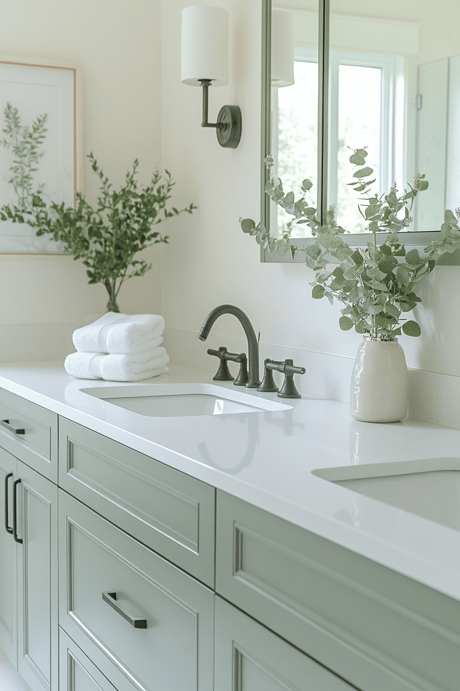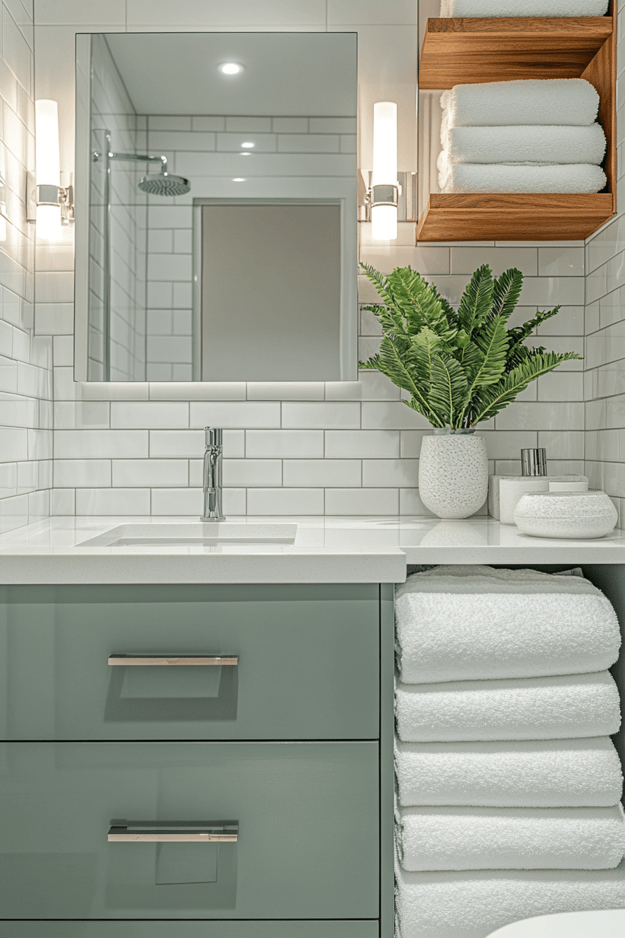 Simple shapes can feel far more welcoming when the palette is softened by the right tones. A sage green and white bathroom looks especially current when streamlined cabinetry, frameless mirrors, and minimal fittings are paired with soft green accents and bright white finishes. White brings the clean structure, while sage prevents the room from feeling too stark. The overall design feels polished without becoming cold. Every line looks intentional and easy to live with. Refresh your bathroom with this modern softness and enjoy the result.