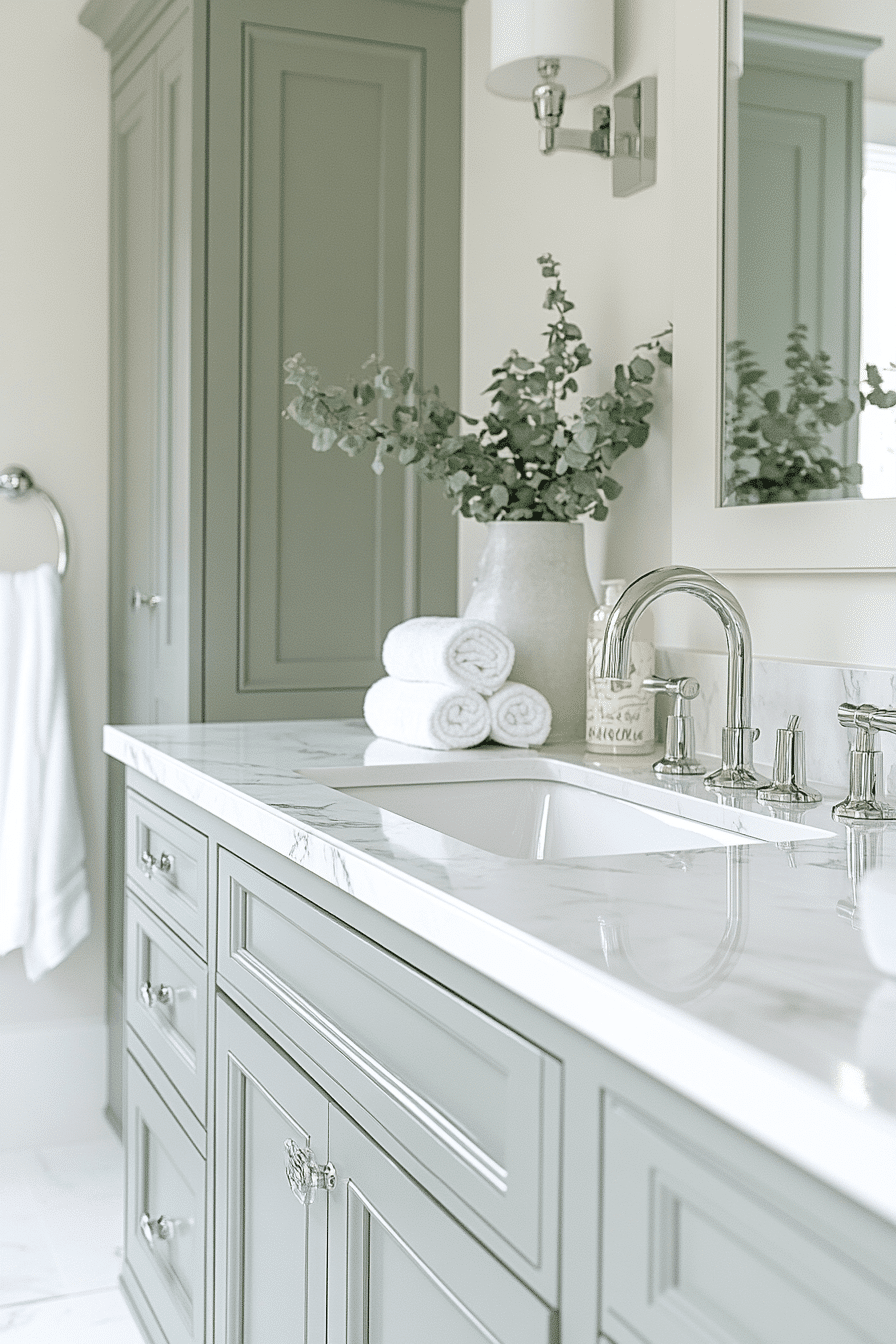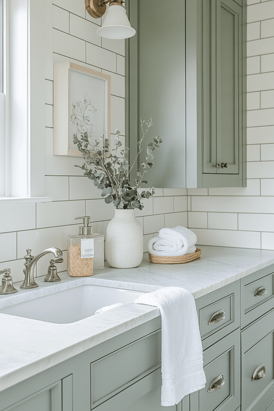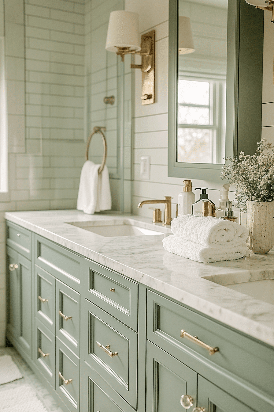 Marble details can make this palette feel even more elevated while keeping it calm. A sage green and white bathroom becomes especially luxurious when bright marble surfaces sit beside muted green cabinetry or walls. The white stone adds movement and brightness, and sage keeps the overall look soft rather than formal. Minimal styling lets the materials shine. The finished room feels polished, timeless, and easy to love. Add this marble-led direction to your bathroom and enjoy the upgrade.