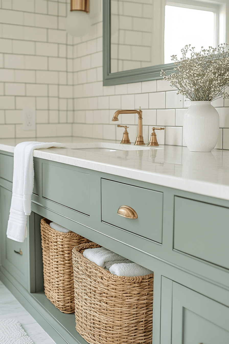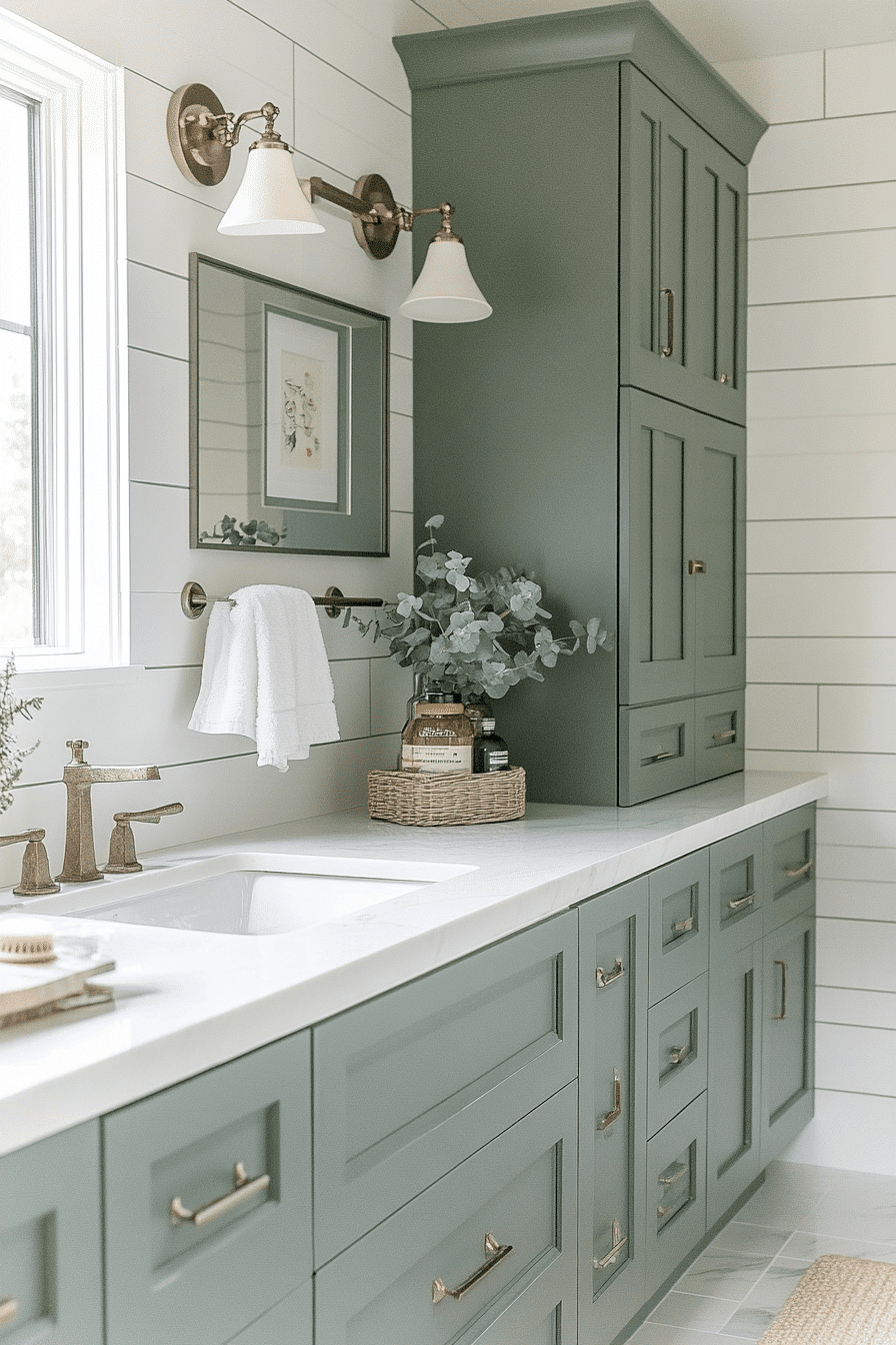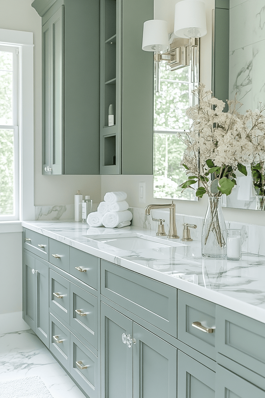 Marble details can make this palette feel even more elevated while keeping it calm. A sage green and white bathroom becomes especially luxurious when bright marble surfaces sit beside muted green cabinetry or walls. The white stone adds movement and brightness, and sage keeps the overall look soft rather than formal. Minimal styling lets the materials shine. The finished room feels polished, timeless, and easy to love. Add this marble-led direction to your bathroom and enjoy the upgrade.