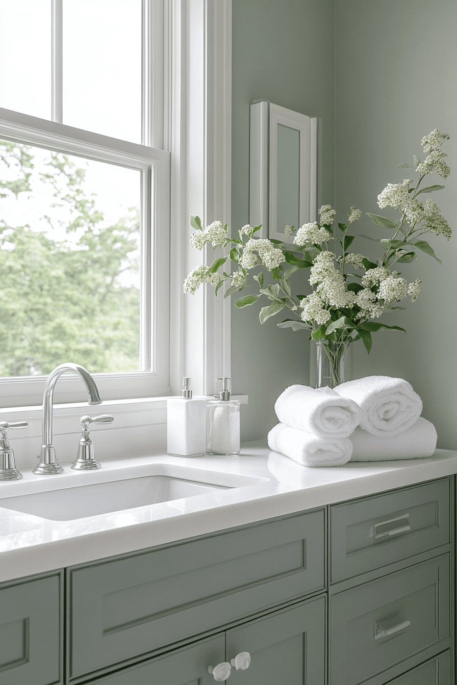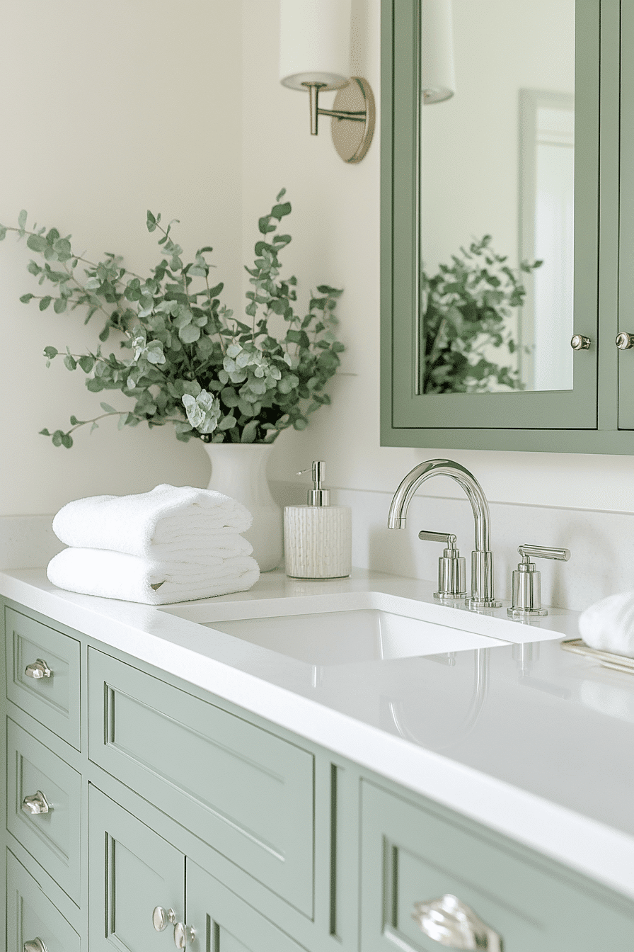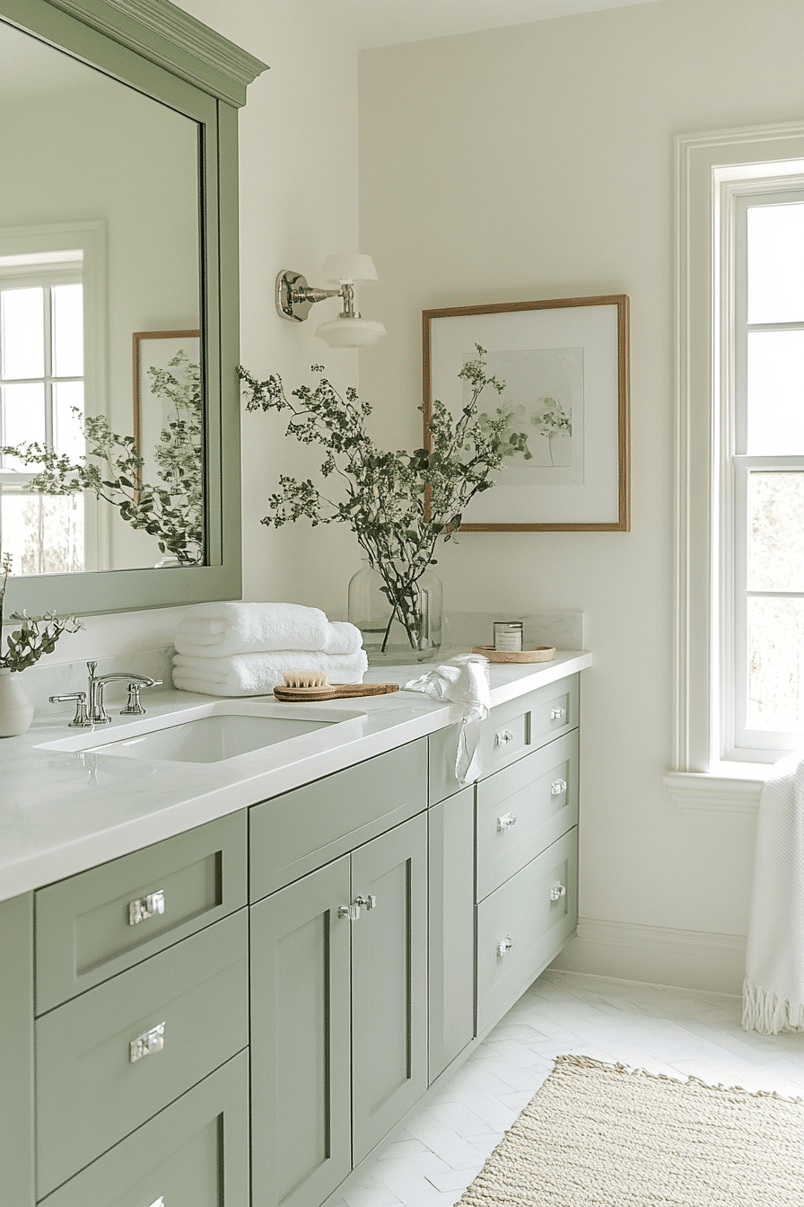 Quiet retreat energy can come from something as simple as thoughtful color placement. A sage green and white bathroom feels especially tranquil when white dominates the large surfaces and sage is layered in through cabinetry, towels, or softer painted elements. This keeps the room open and bright while adding calm and personality. Minimal decor helps preserve the uncluttered mood. The final effect is soothing and restorative. Design this peaceful escape and enjoy a bathroom that invites you to slow down.