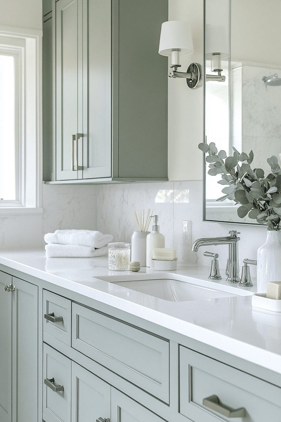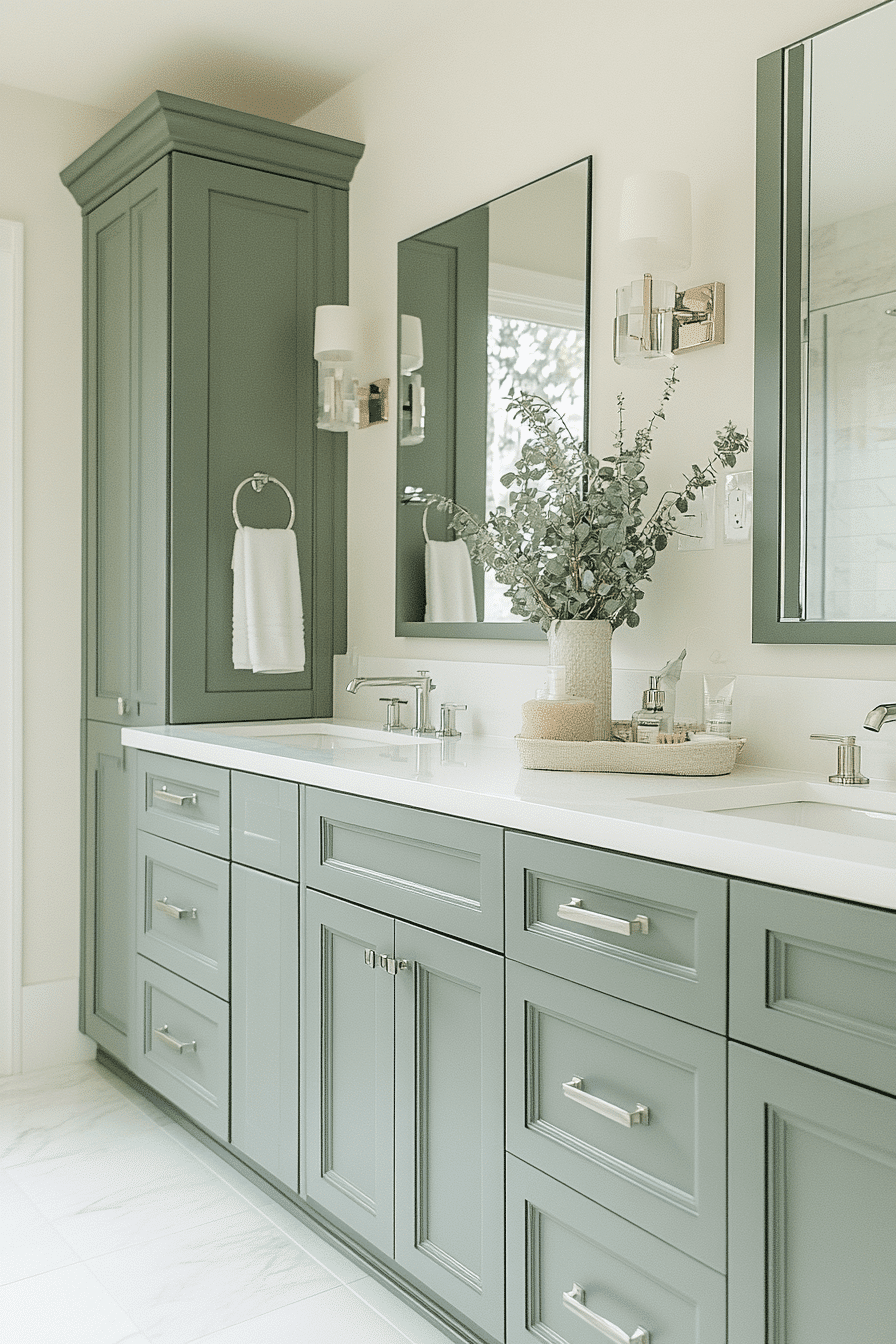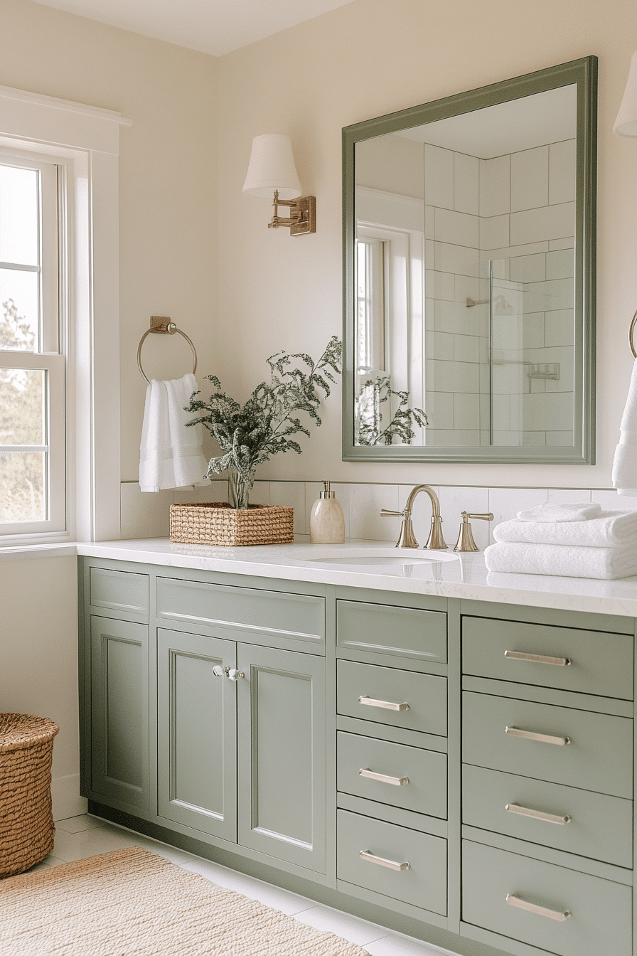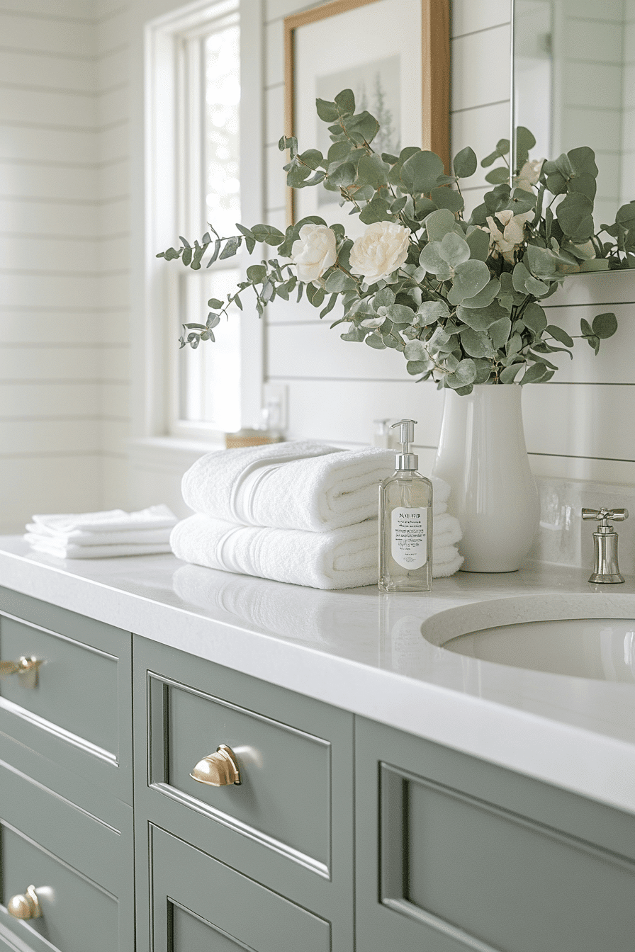 Quiet retreat energy can come from something as simple as thoughtful color placement. A sage green and white bathroom feels especially tranquil when white dominates the large surfaces and sage is layered in through cabinetry, towels, or softer painted elements. This keeps the room open and bright while adding calm and personality. Minimal decor helps preserve the uncluttered mood. The final effect is soothing and restorative. Design this peaceful escape and enjoy a bathroom that invites you to slow down.