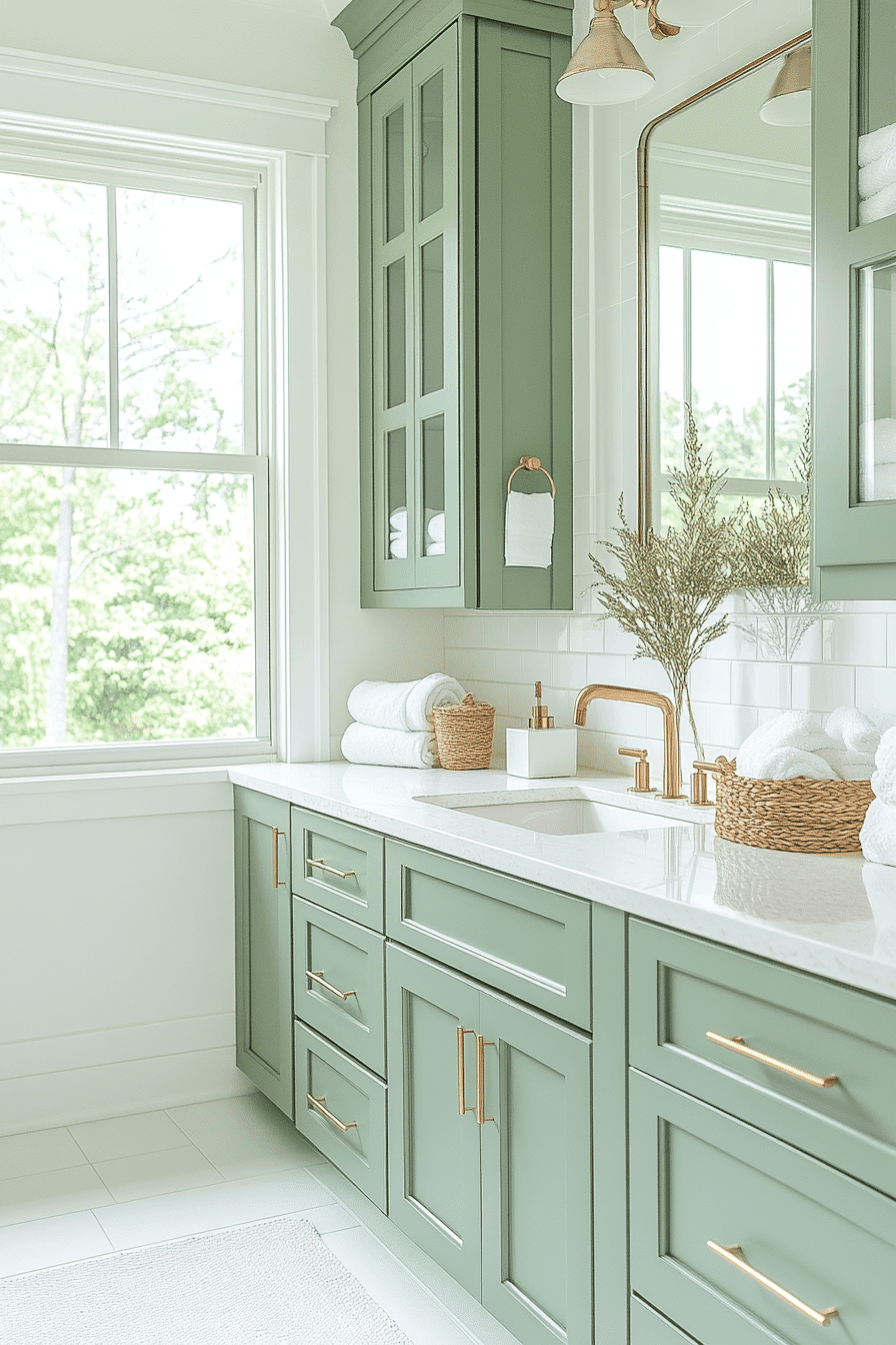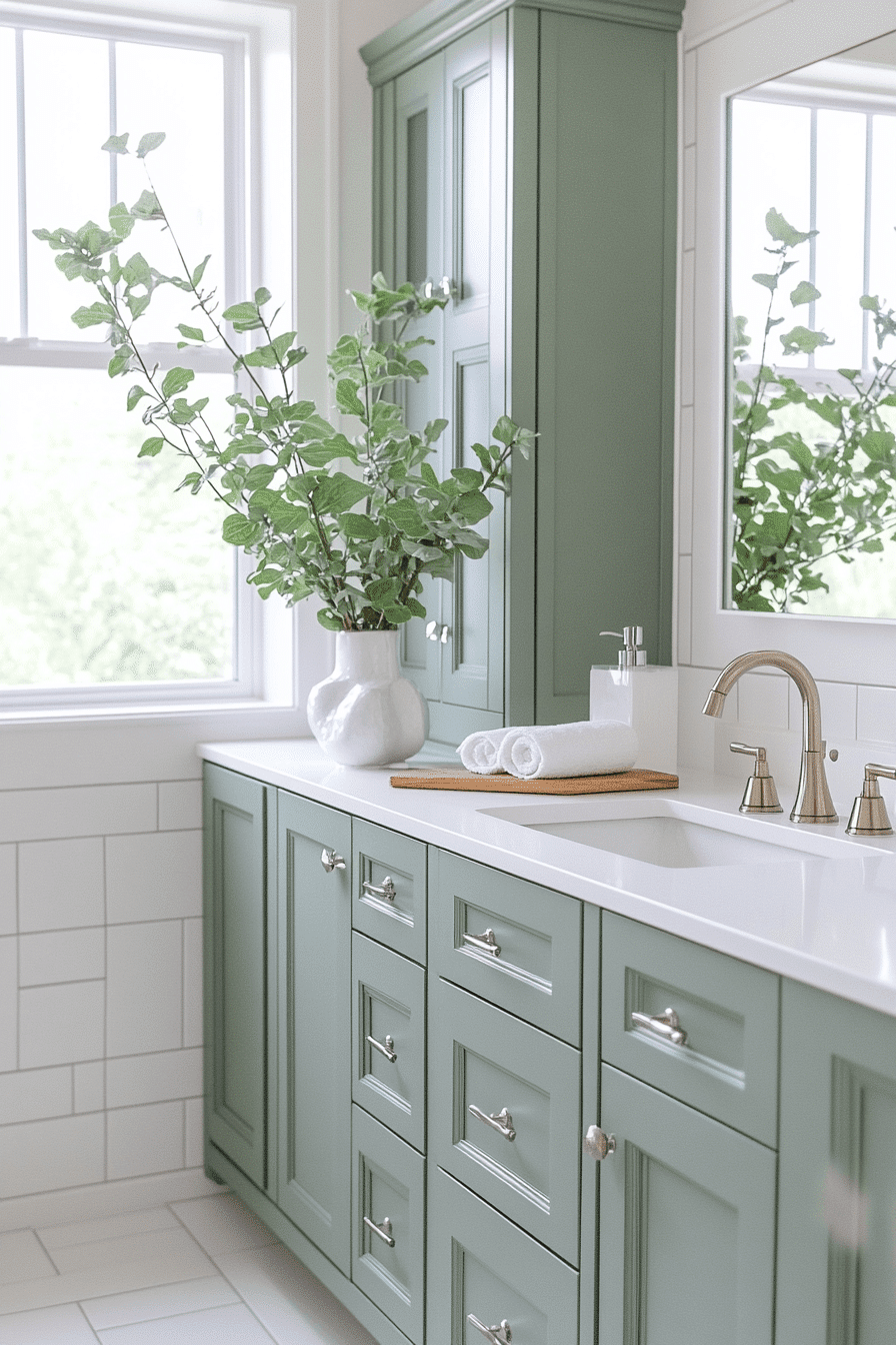 Brightness can become the star of the room when white is given room to lead. A sage green and white bathroom feels especially spacious when walls, tile, or floors are kept bright and sage appears through cabinetry or smaller accents. White reflects daylight beautifully, while sage adds enough depth to keep the design from feeling flat. This approach works especially well in compact spaces. The room ends up looking fresh, open, and uplifting. Create this light-filled look and enjoy the extra sense of space.