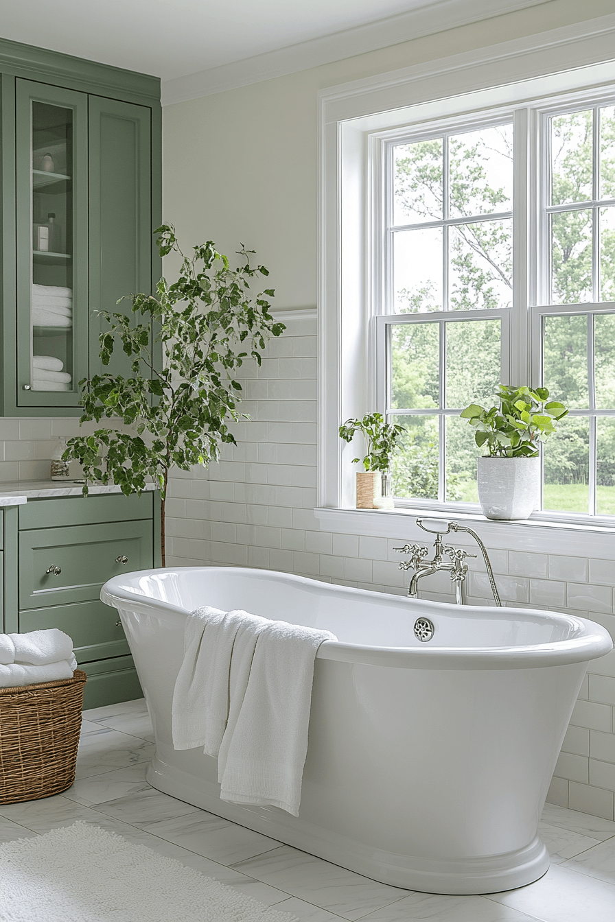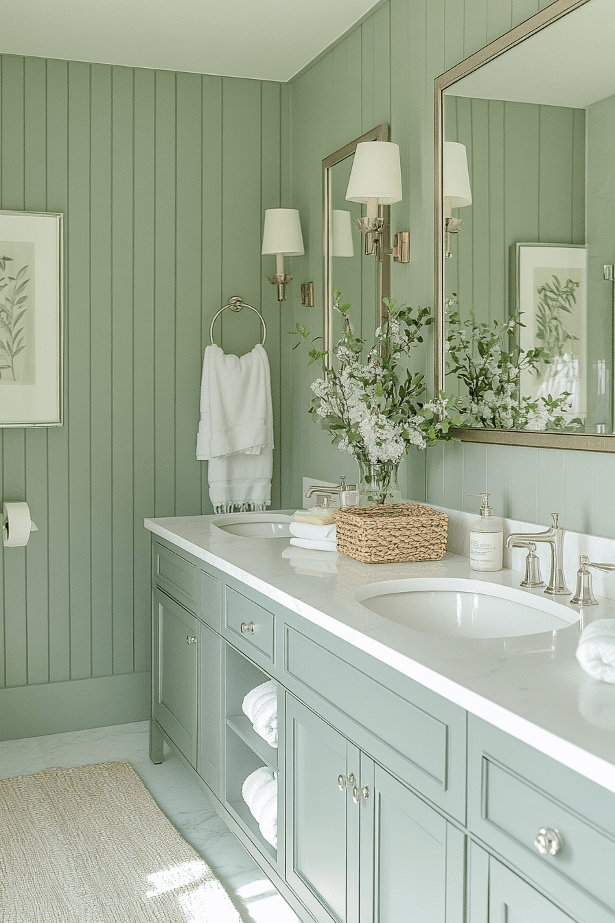 Calm contrast is what gives this palette its lasting appeal. A sage green and white bathroom feels perfectly balanced when crisp white features are paired with soft green cabinetry, trim, or a single painted wall. White adds clarity and brightness, while sage brings warmth and personality without making the room feel busy. The design stays timeless because the contrast is gentle. The whole room feels fresh, composed, and beautifully restrained. Use this balanced color story and elevate your bathroom with ease.