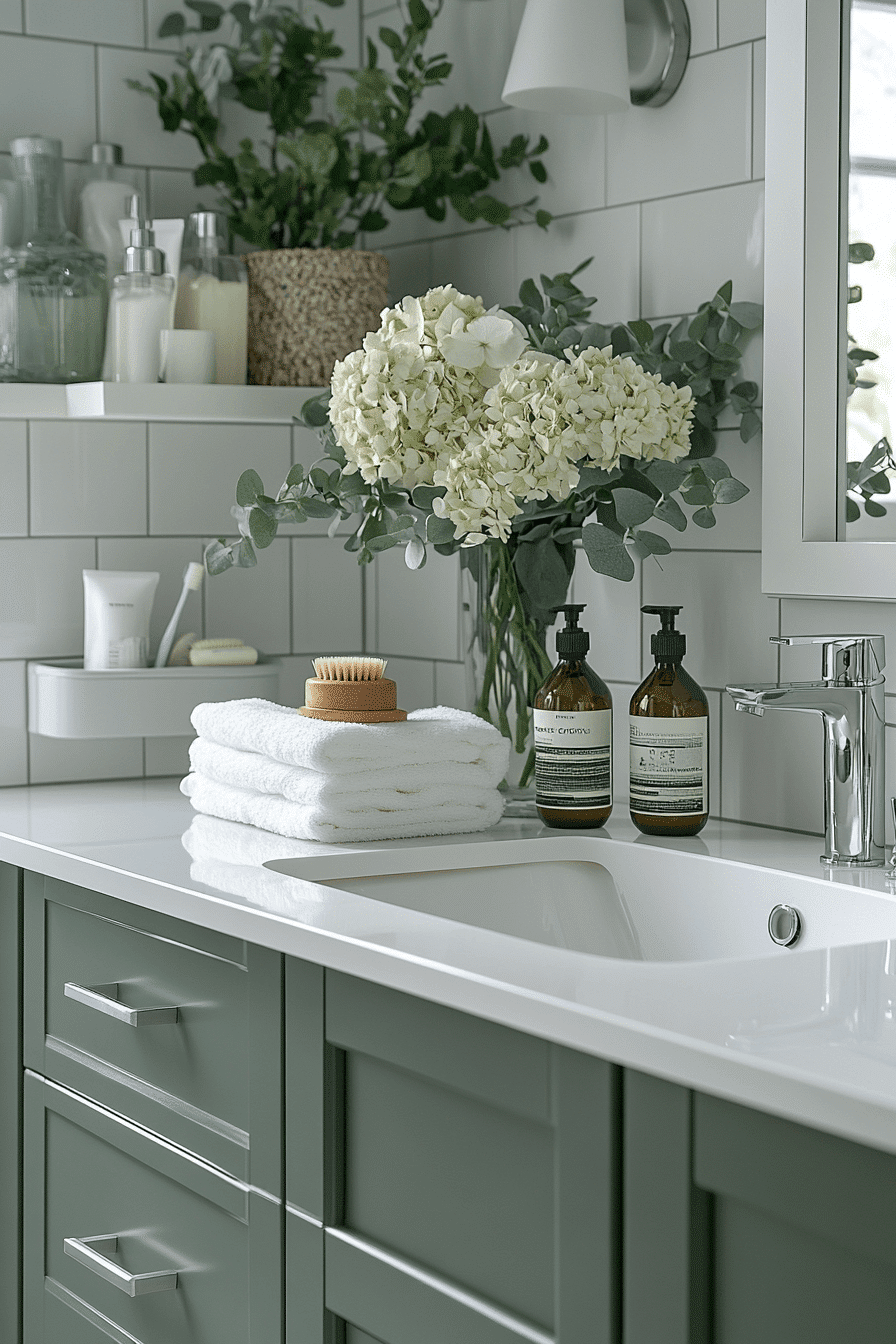 Fresh color can completely change how a bathroom feels the moment you step inside. A sage green and white bathroom brings that effect to life with white surfaces that keep everything bright and green accents that add a gentle, welcoming softness. Glossy tile, a muted sage vanity, and clean styling help the room feel open without seeming plain. The contrast stays light and calming rather than sharp. Warm lighting and a few neatly placed details make the whole space feel more inviting. Bring this fresh atmosphere into your bathroom and enjoy the shift it creates.