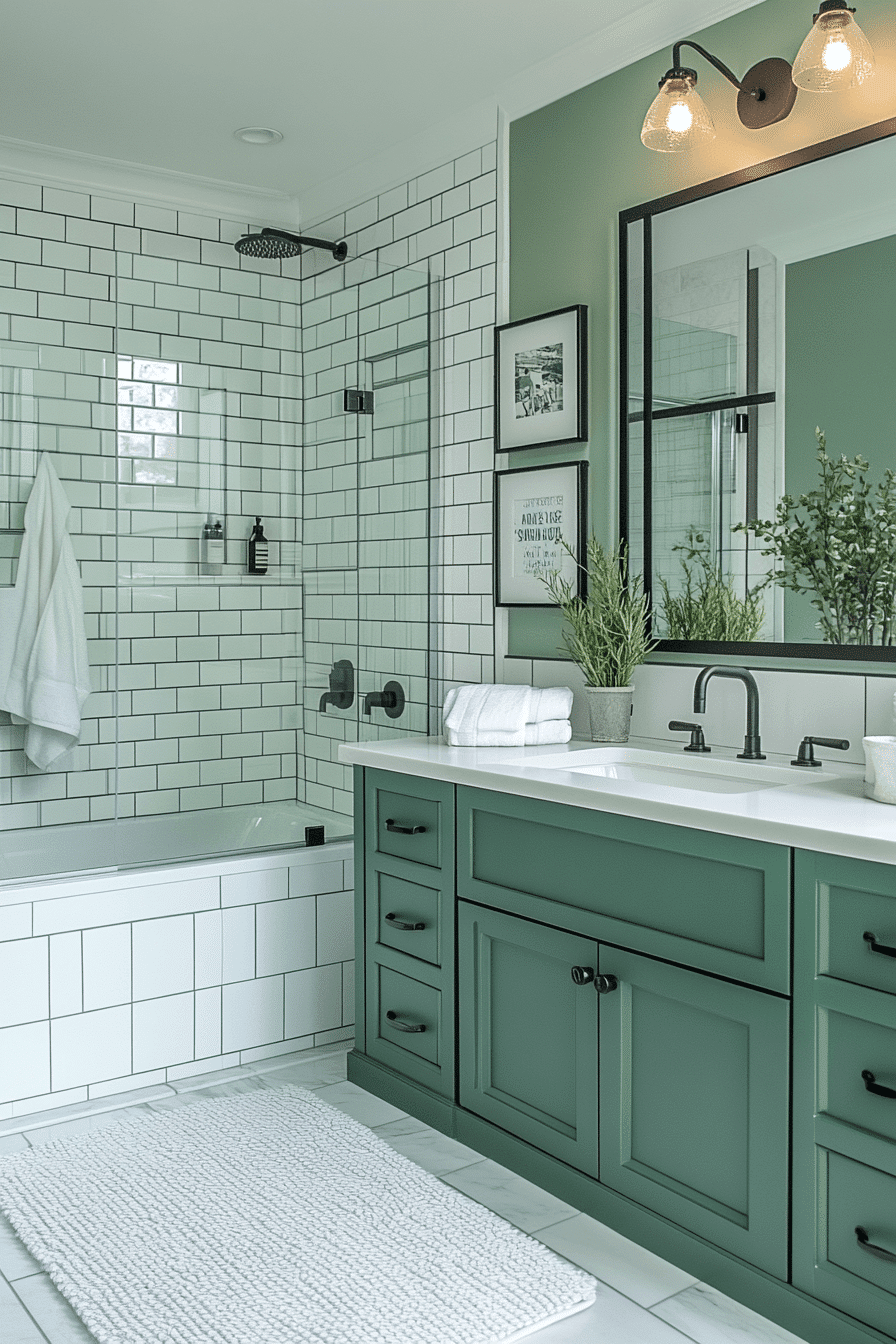 A sage green and white bathroom captures the essence of a spa retreat, combining the freshness of white with the calming influence of nature-inspired green. These ideas show how to create a bathroom that feels clean, serene, and endlessly refreshing.