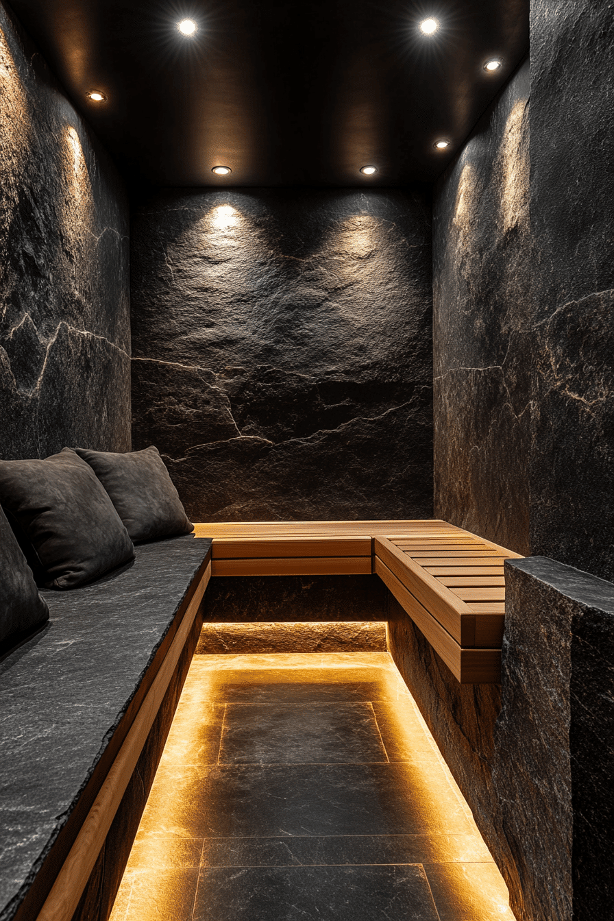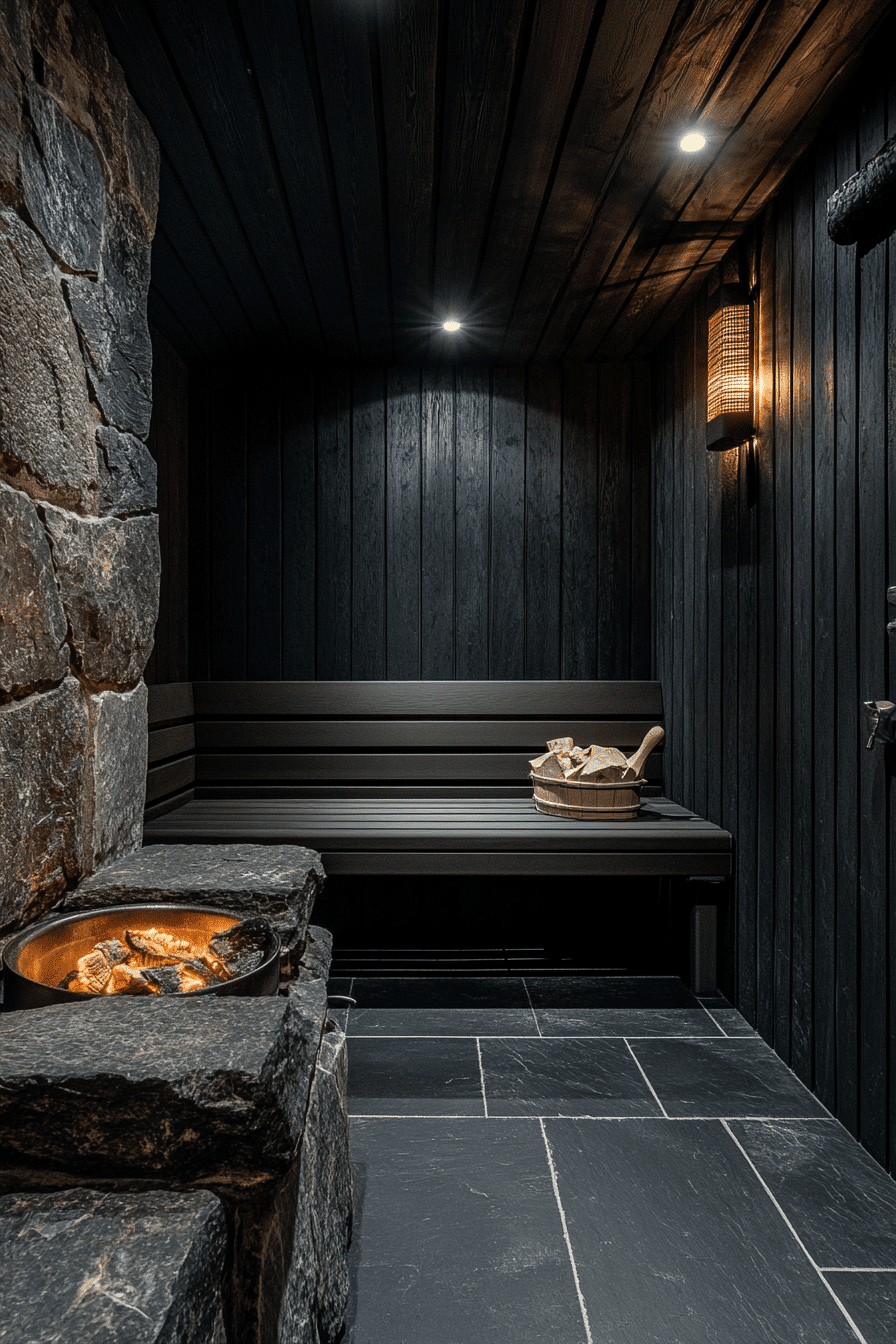 Introduce dramatic style with sauna ideas that use dark stone finishes for a bold look. Deep tones create a sleek and contemporary vibe. Heat-retaining materials enhance performance and comfort. Accent lighting adds depth and mood. The space feels powerful yet relaxing. Elevate your design with these bold sauna ideas.