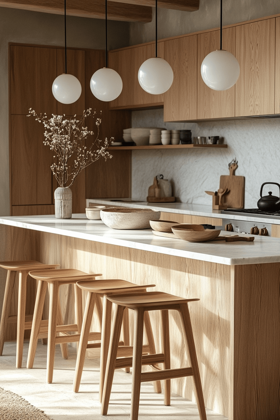 Warm tones and clean lines define this minimalist kitchen inspired by Scandinavian Japanese design. Smooth wood cabinetry and stone countertops create a bright yet grounded atmosphere. Sunlight enhances every detail, reflecting balance and joy. It’s a kitchen that feels both peaceful and inspiring to cook in.