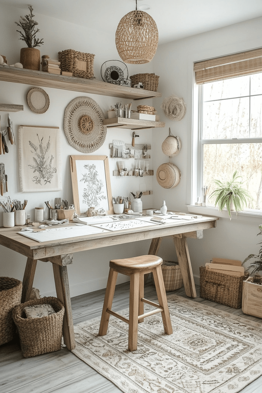 Crafting feels effortless in this serene creative space. Natural materials, warm lighting, and simple organization inspire focus. Every surface is calming, every tool easy to reach. The air feels bright, clear, and happy.