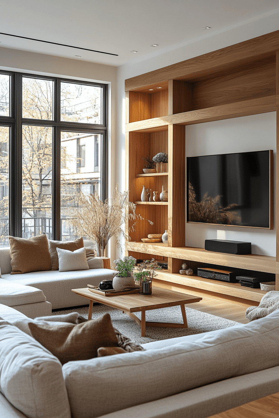 This living room blends minimalist comfort with soul-soothing balance. Light woods, soft fabrics, and low furniture make the space feel open and grounded. Every texture adds a layer of quiet happiness. Natural light fills every corner, creating a glow that feels alive.